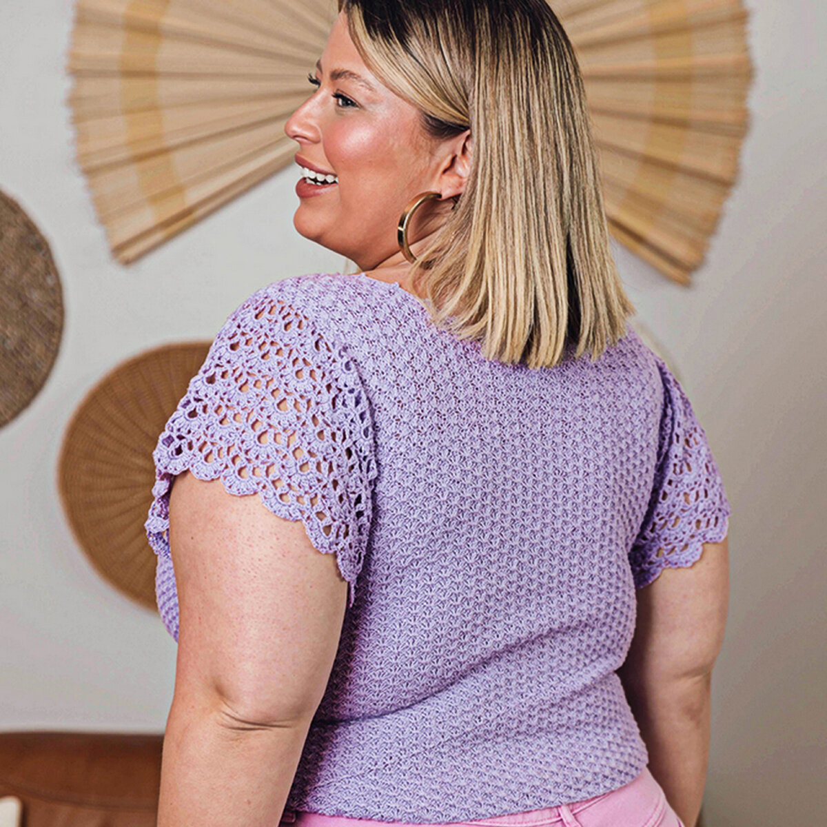 Нежный сиреневый топ крючком с ажурными рукавчиками. Основная часть связана плотным рельефным узором, поэтому можно не переживать о подкладке — она здесь не нужна.