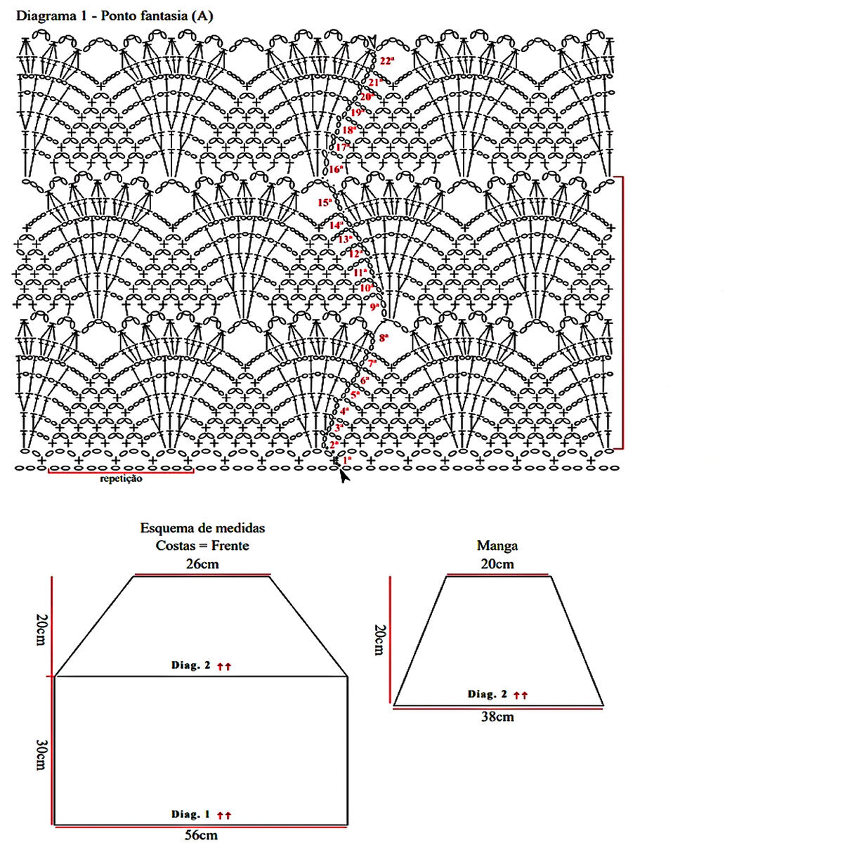 Брусничный топ крючком с крупным узором «веера». Прямой фасон до пояса, короткий рукавчик и широкий вырез горловины.