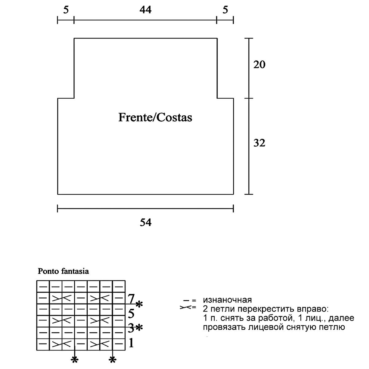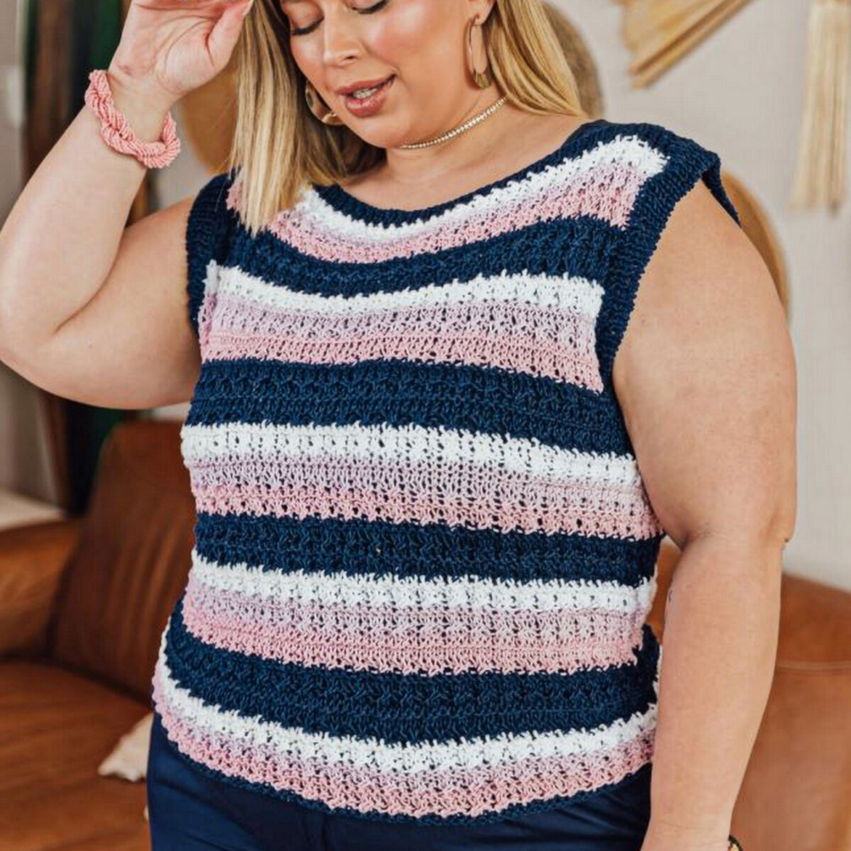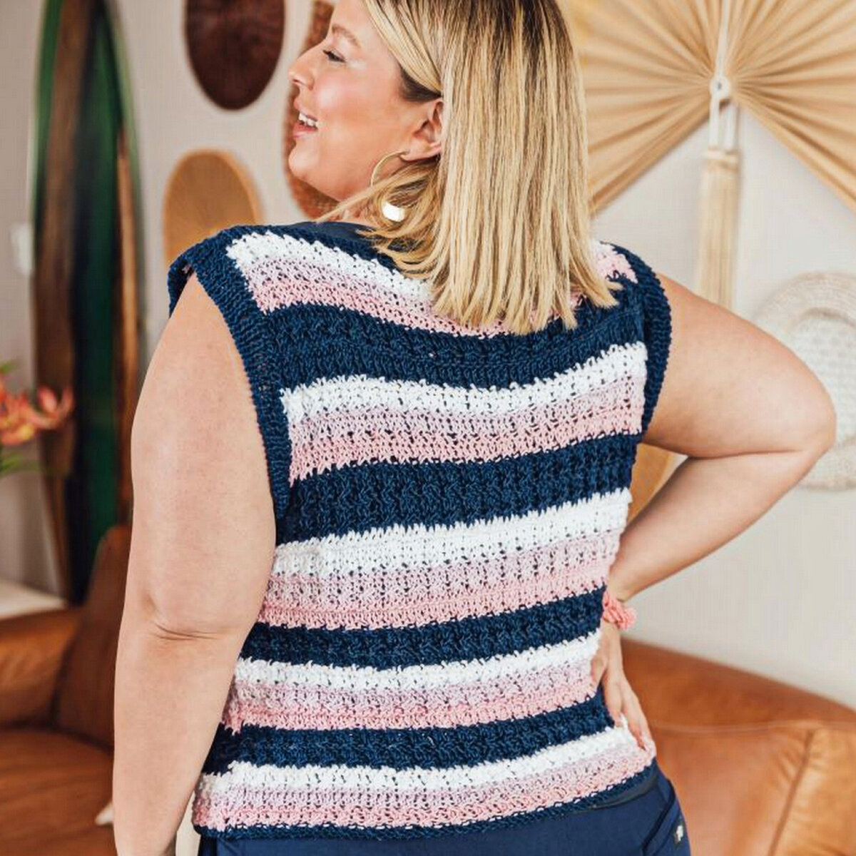 Полосатый топ спицами, который вполне сойдёт и за безрукавку. Можно надеть поверх блузки или тонкой водолазки. Хороший вариант на весну! Прямой фасон до пояса, небольшой вырез лодочкой.