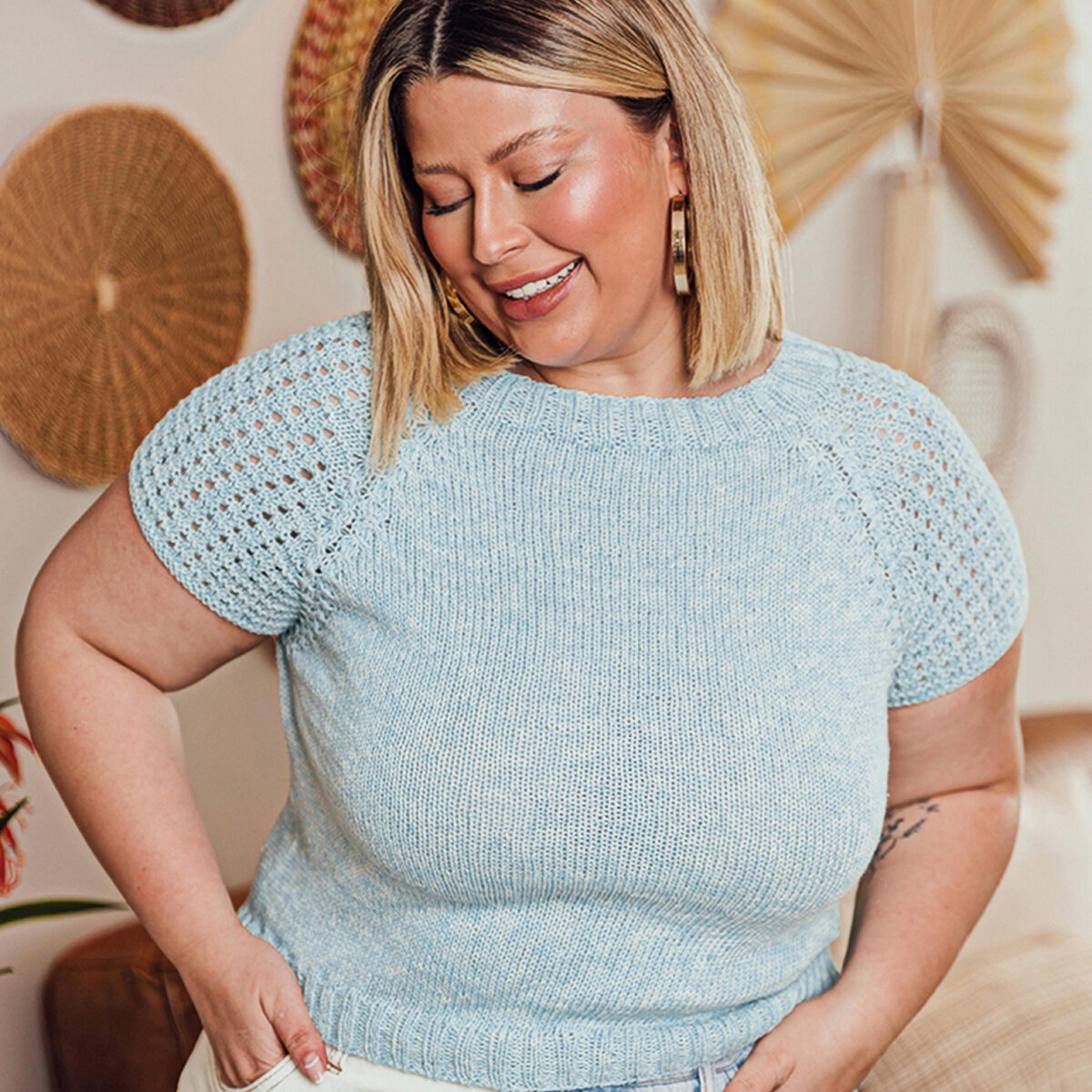 Светло-голубая футболочка спицами с рукавами-реглан и лёгким эффектом меланжа. Просто и стильно! Слегка укороченный фасон до талии. Основная часть модели связана лицевой гладью, а небольшие рукавчики ажурной сеткой. Футболка вяжется снизу вверх, но можно связать и сверху вниз — в таком случае, в месте регланных убавлений делайте прибавления, вывязывая из одной петли две по обе стороны от этой петли, чтобы не было дырочек.