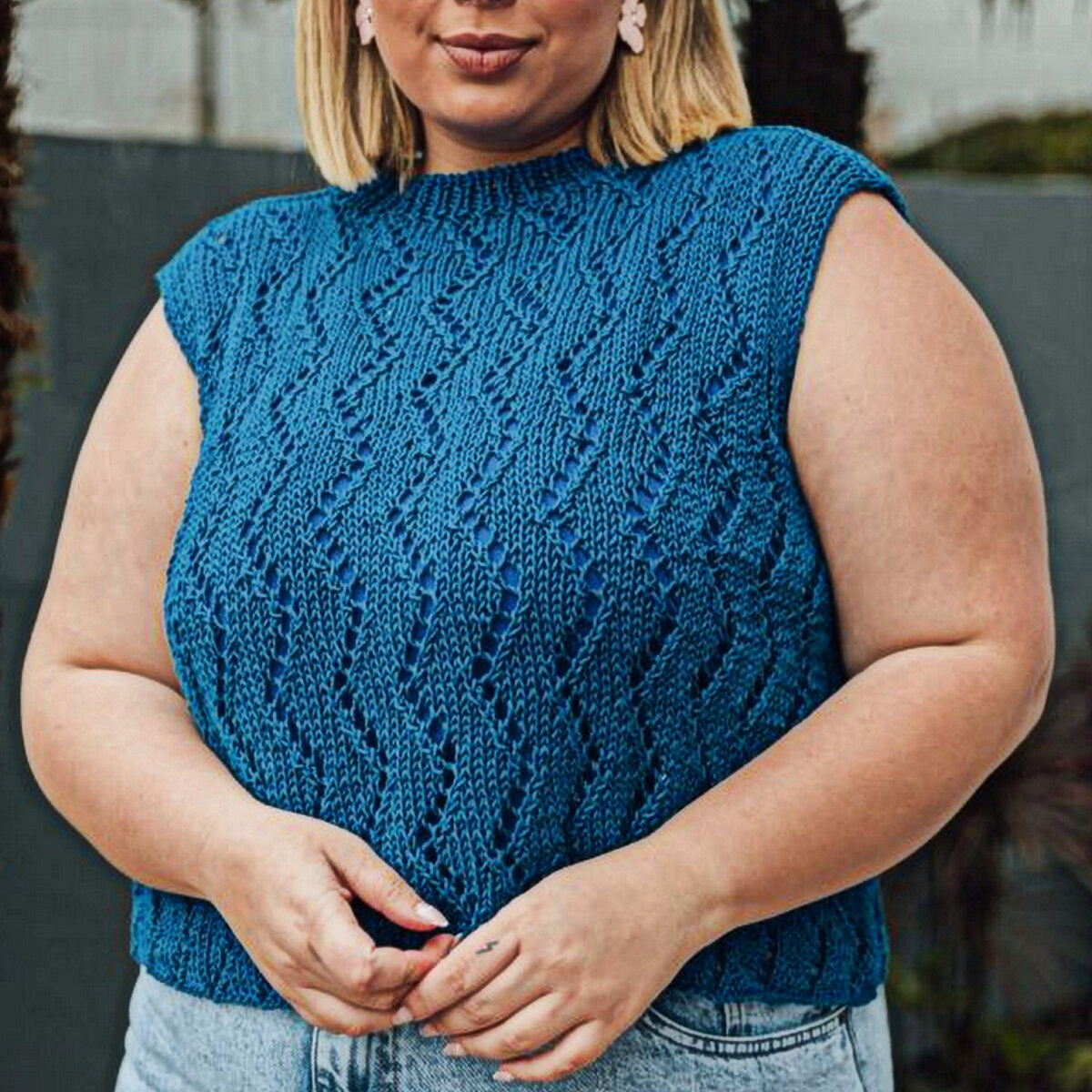 Синий топ спицами с высоким воротом, который можно использовать в качестве безрукавки, поверх тонкой водолазки. Прямой фасон до талии, круглый вырез горловины и ворот-стойка.