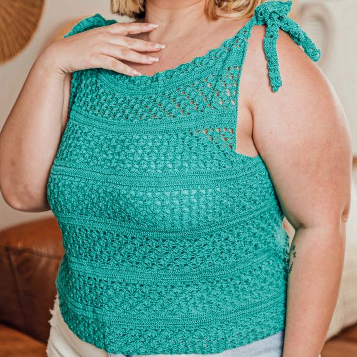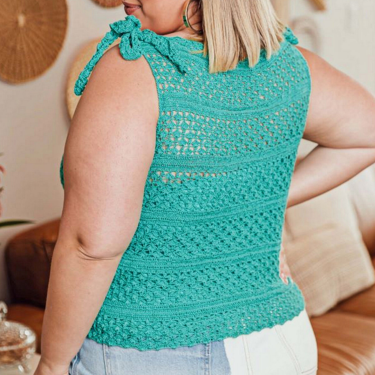 Кокетливый малахитовый топ на завязочках. Простое и одновременно изысканное сочетание ажурных «ракушек» и полос из столбиков с накидом.