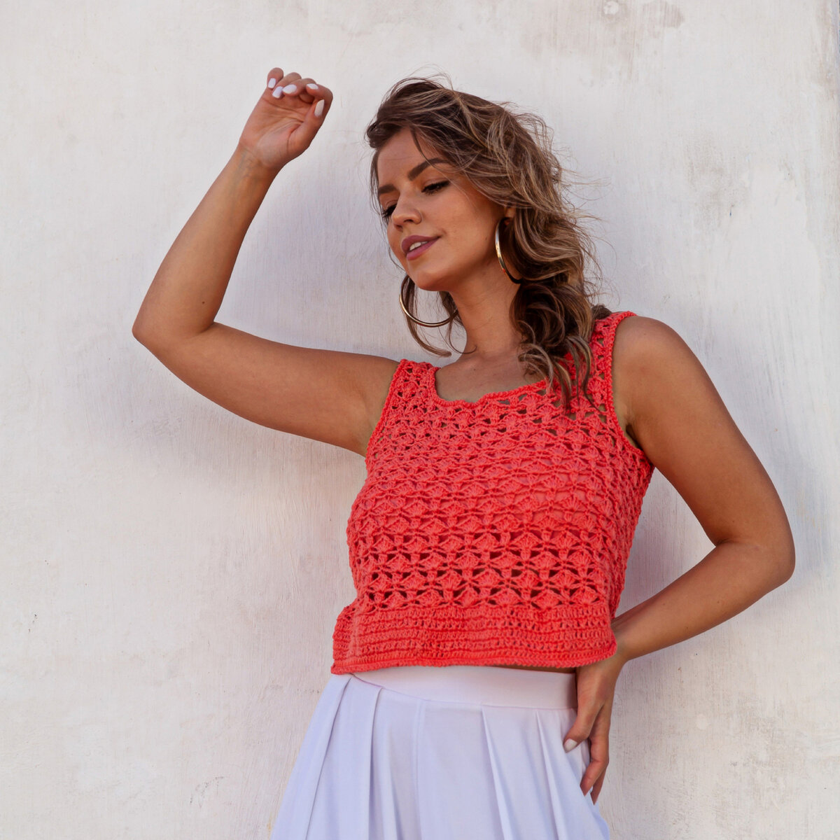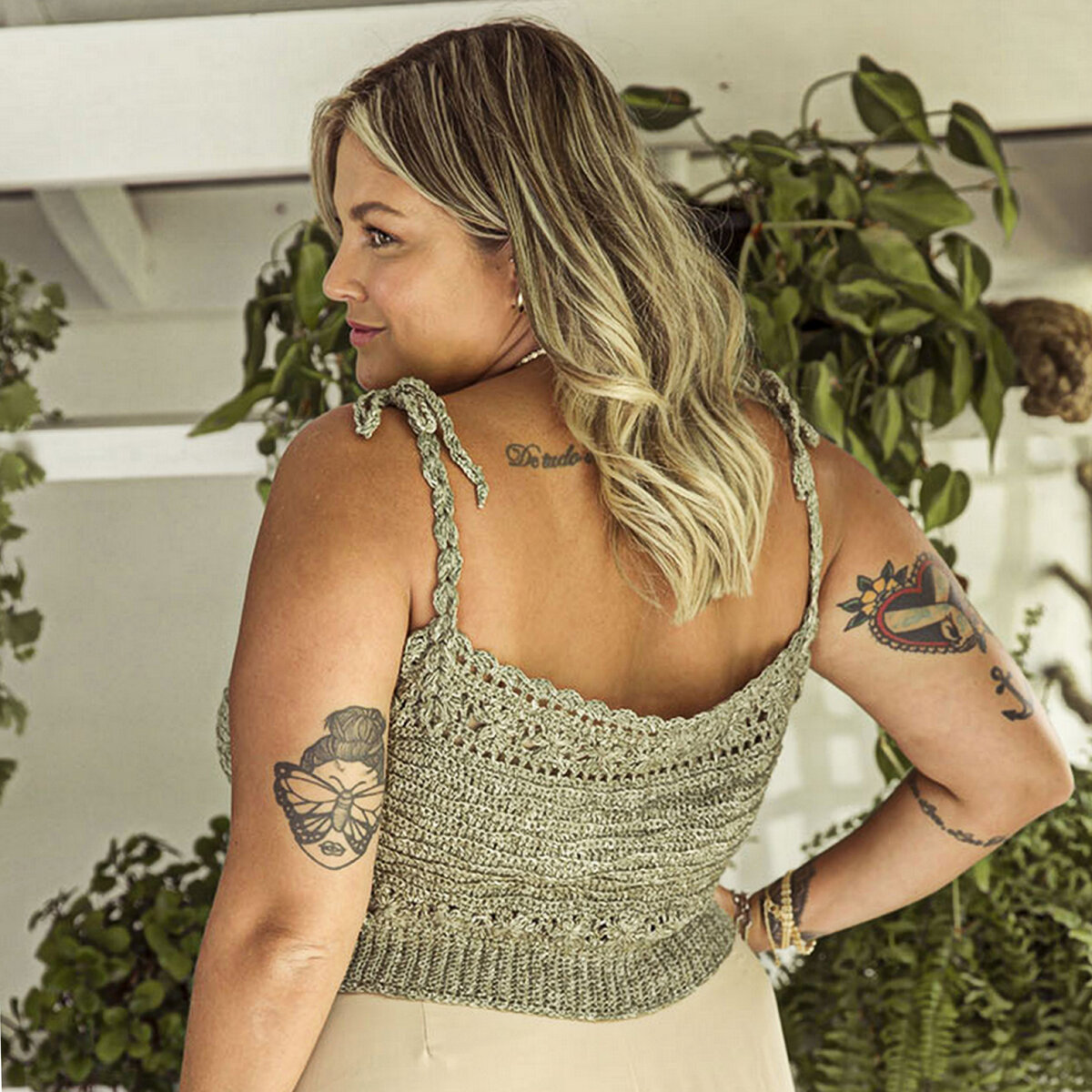 Элегантный укороченный топ на тонких лямочках с классическим диагональным рисунком из ромбов. Простая модель, которая вяжется обычными столбиками с накидом — справится даже новичок!