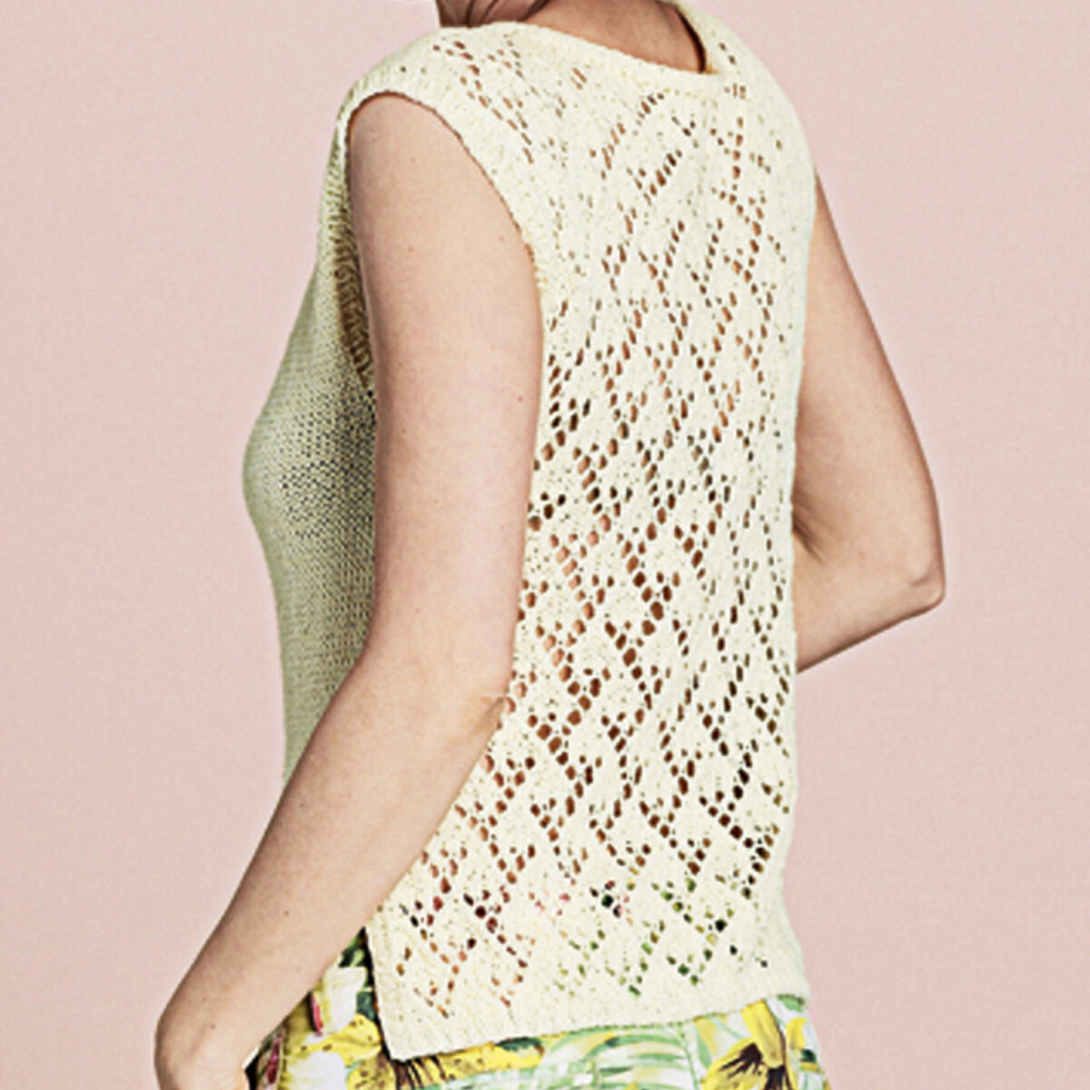 Ещё один простой топ, изюминка которого в спинке. Перед этой светло-салатовой модели связан обычной лицевой гладью, а вот спинка — симпатичным ажурным узором. Небольшие боковые разрезы довершают кокетливый образ.