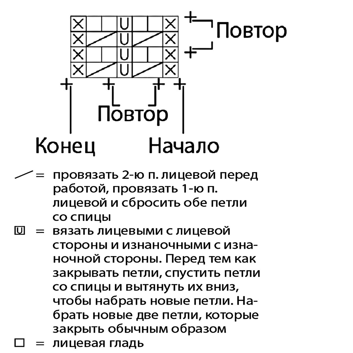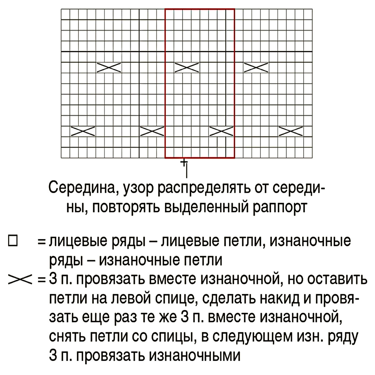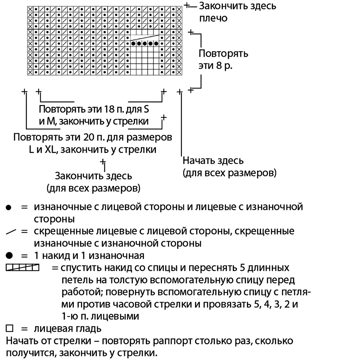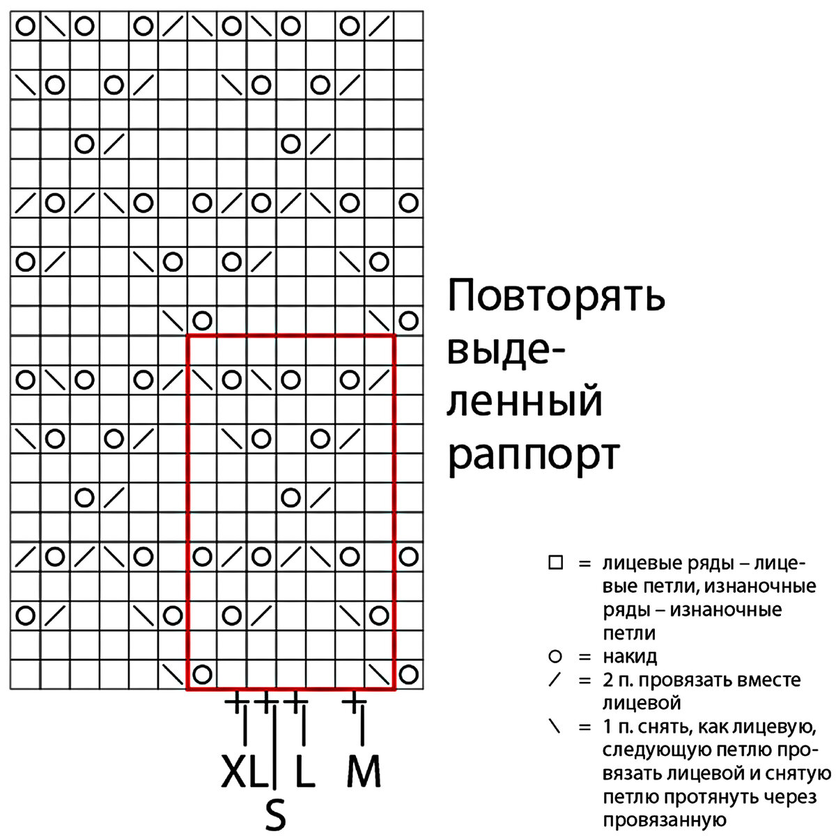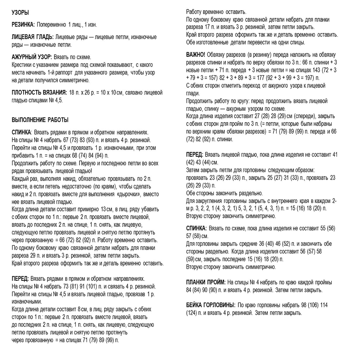 Нам понадобится 4 (4) 5 (5) мотков — на размеры S (M) L (XL) соответственно — светло-салатовой пряжи: 50% лён, 50% хлопок; 50 гр — 125 м. Круговые спицы № 4 длиной 60 см или 80 см, а также круговые спицы № 4,5 длиной 80 см.