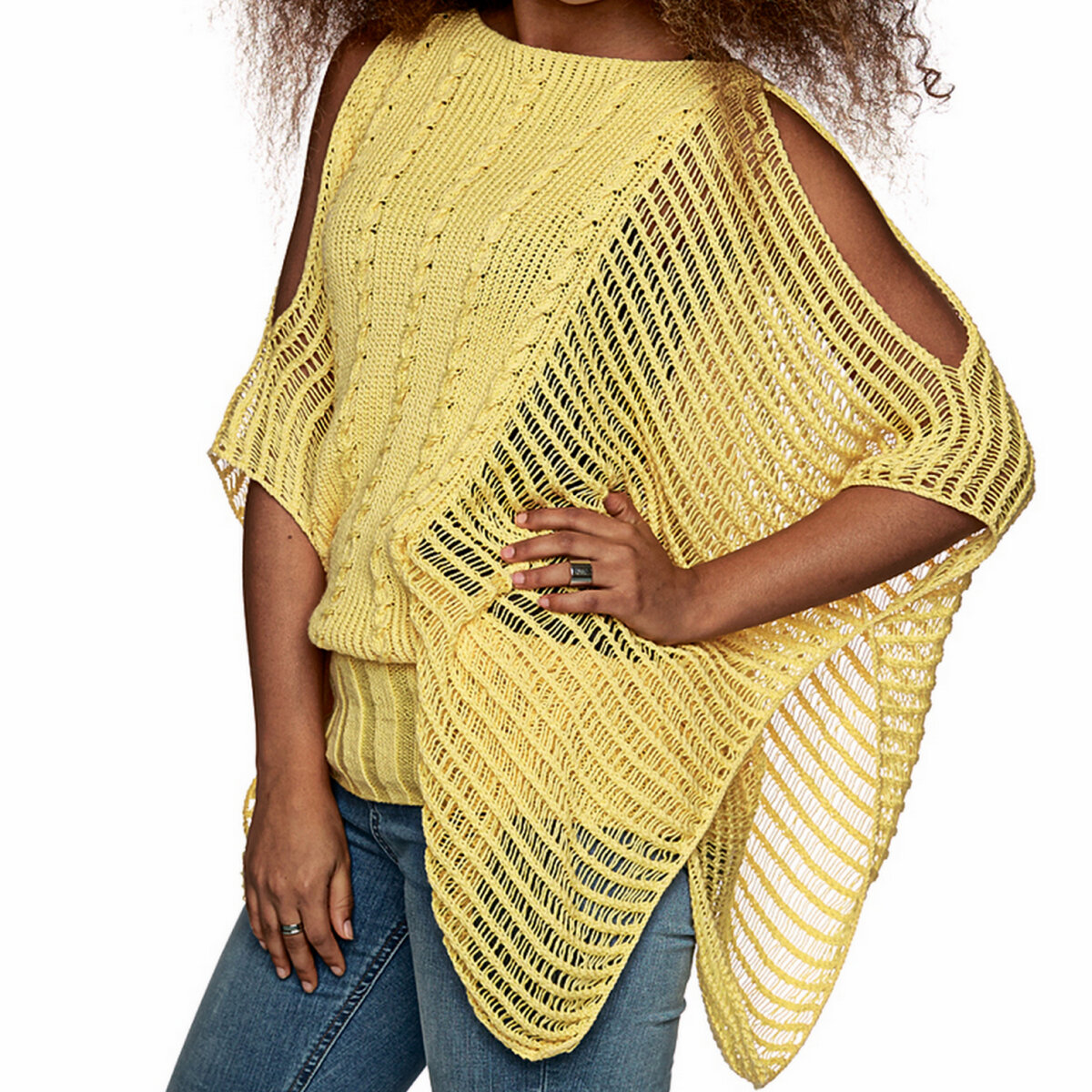 Эффектный жёлтый топ-размахайка с широкими сетчатыми рукавами и рельефным узором из жгутов по центру. Необычная модель с эффектом асимметричного кроя.