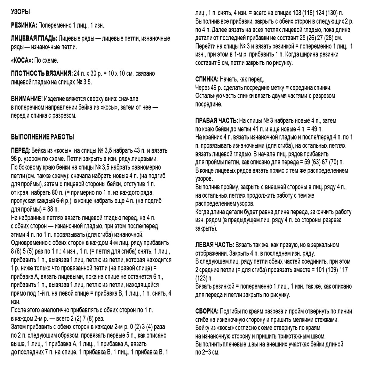 Нам понадобится 10 (10) 11 (11) мотков — на размеры S (M) L (XL) соответственно —жёлтой пряжи: 50% хлопок, 50% акрил; 50 гр — 150 м. Спицы № 3,5, а также круговые спицы № 3,5 длиной 80 см.