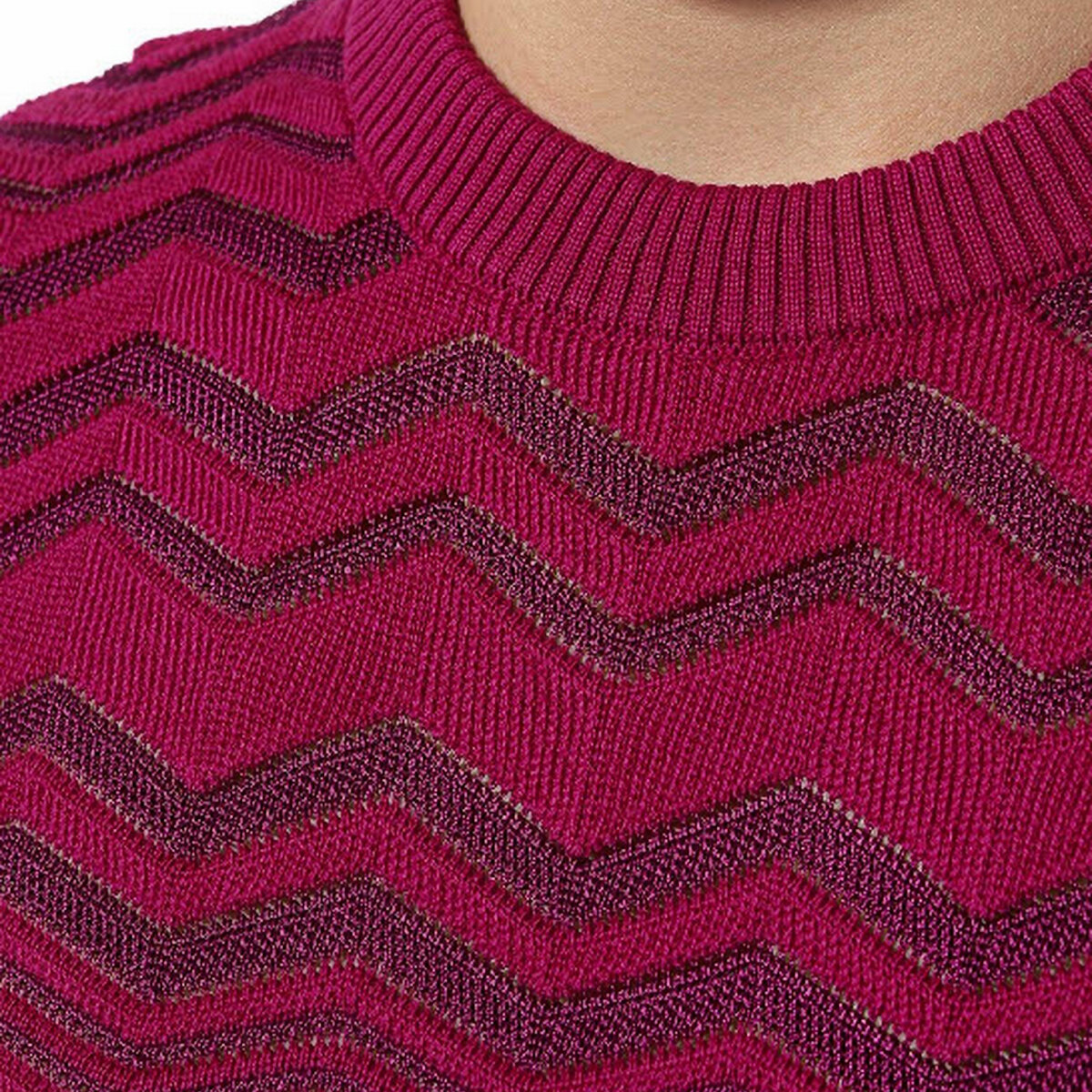 Принадлежность розового платья бренду, основанному супругами Миссони, можно легко определить по знаковому зигзагообразному узору. На этот раз фирменный орнамент сделали практически однотонным, отказавшись от сложной палитры и подчеркнув мотив лишь шелковистым блеском. Модель с длинными рукавами выполнили из мягкой шерсти с добавлением вискозы.