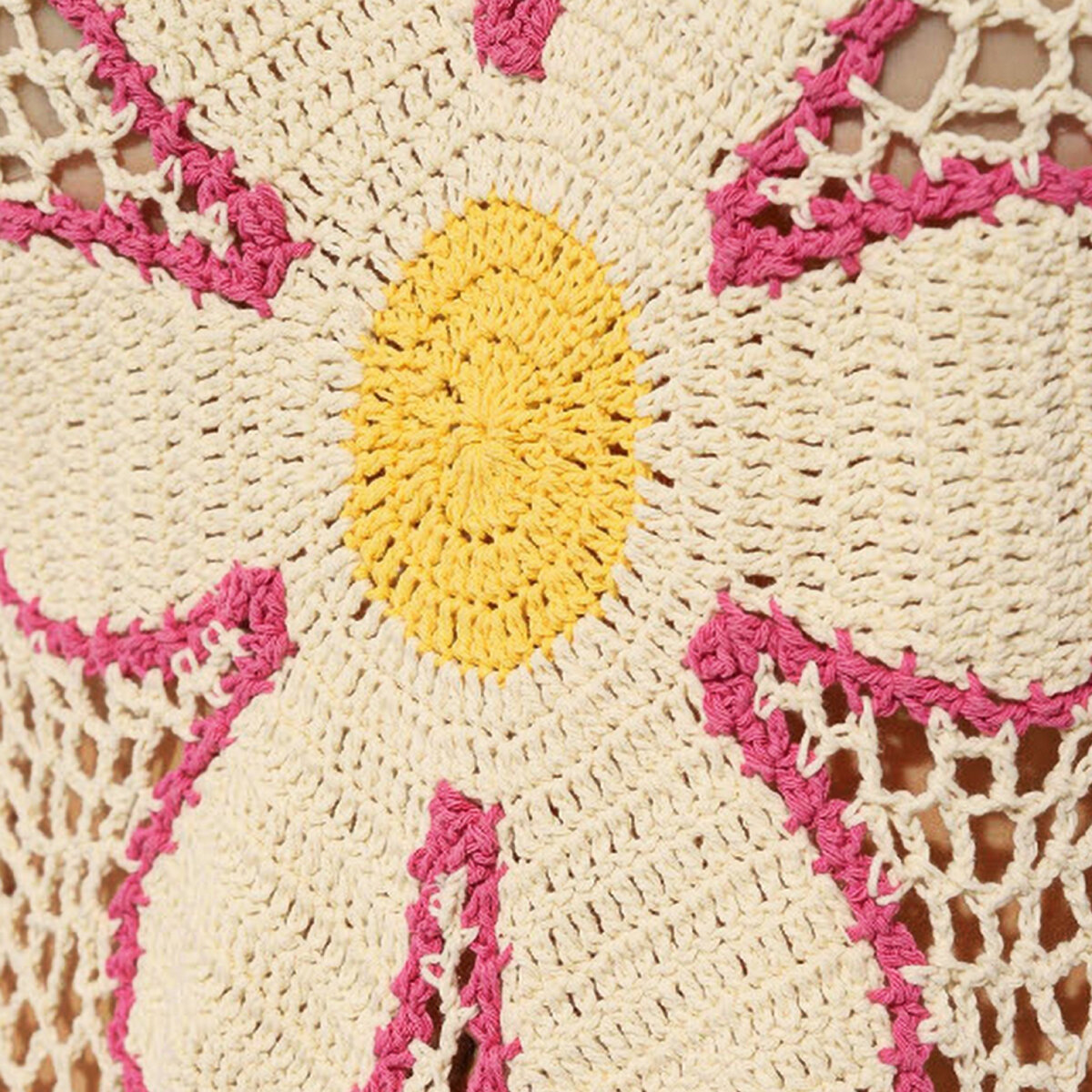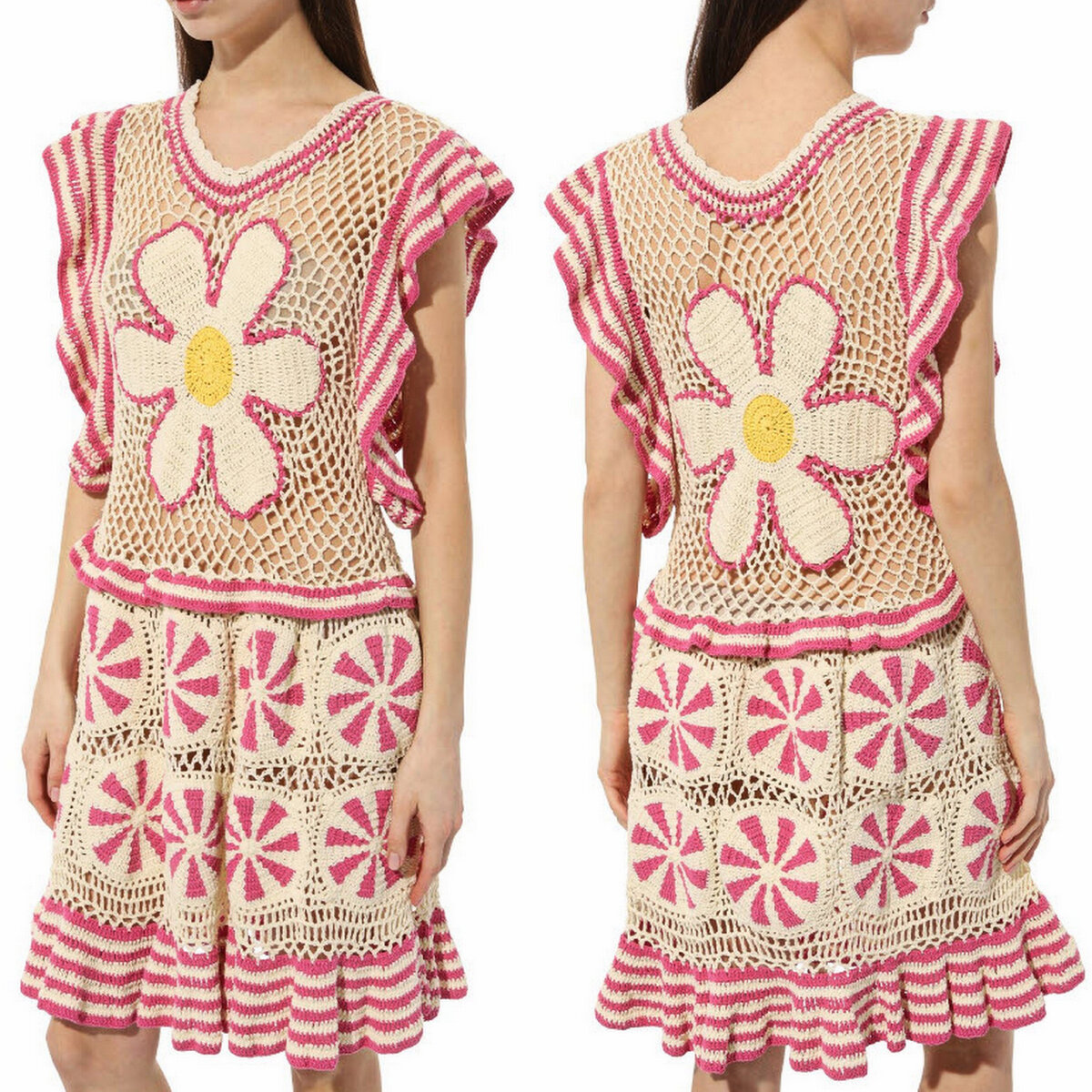 Селия Бернардо дополнила ажурное мини-платье полосатыми рукавами-крыльями и оборками на талии и внизу. Модель из мягкой хлопковой пряжи мастера марки связали вручную в технике кроше. На лифе с двух сторон ‒ крупные цветы, с которыми перекликается орнамент на подоле. Романтичный летний образ завершат черные шлепанцы и сумка