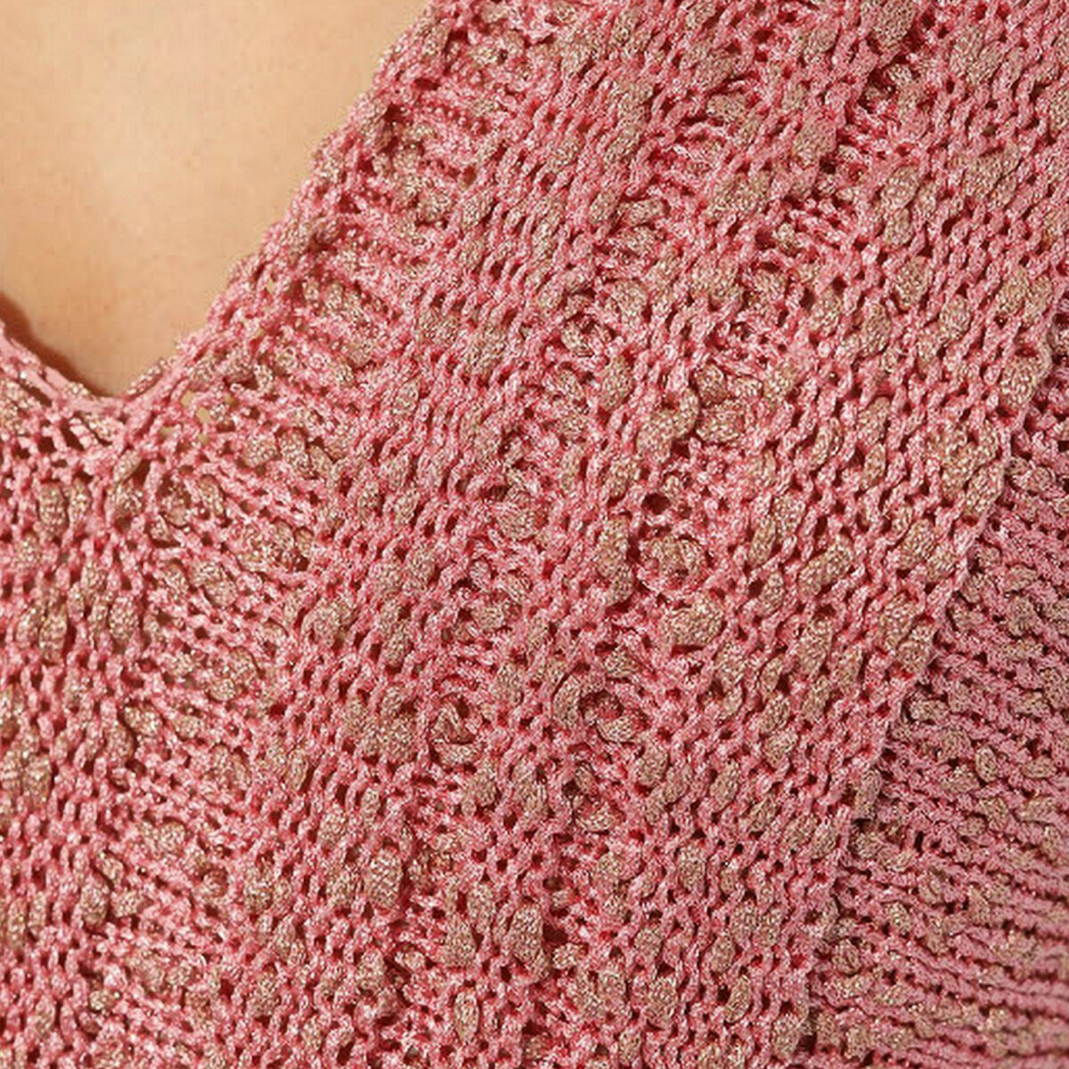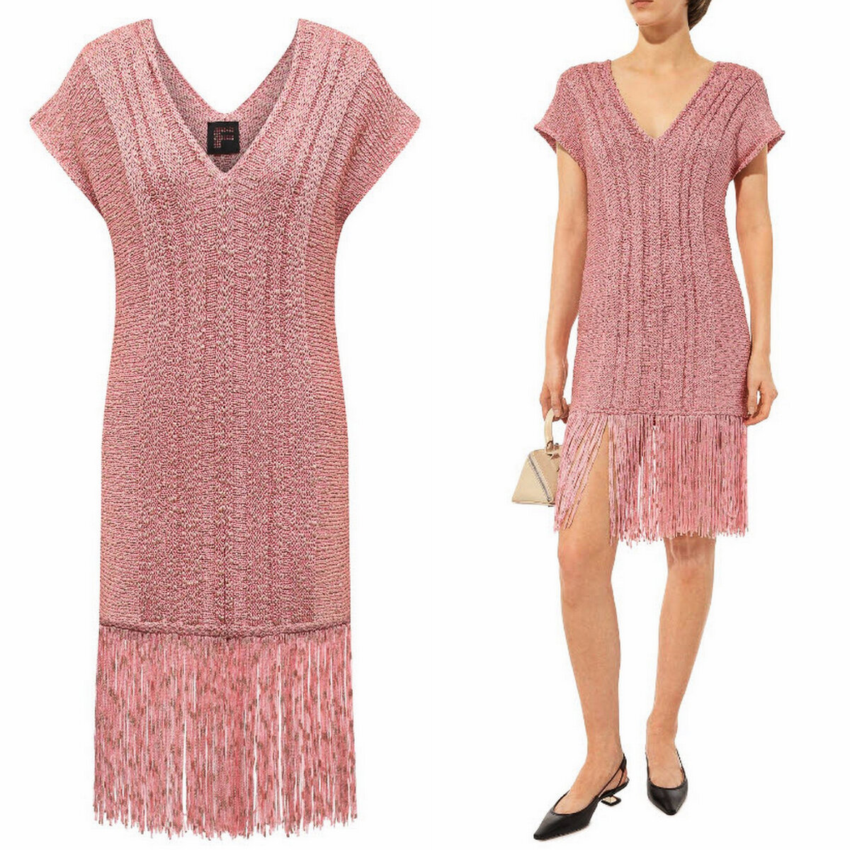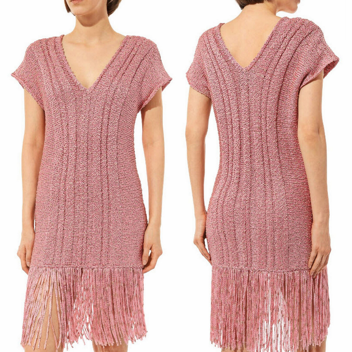 Мастера марки создали прямое платье из глянцевой шелковистой пряжи. Деликатное сияние нитей розового и золотистого цветов придало визуальный эффект объема вывязанному узору. Он зрительно моделирует силуэт, а акцент на ноги переносит длинная бахрома.
