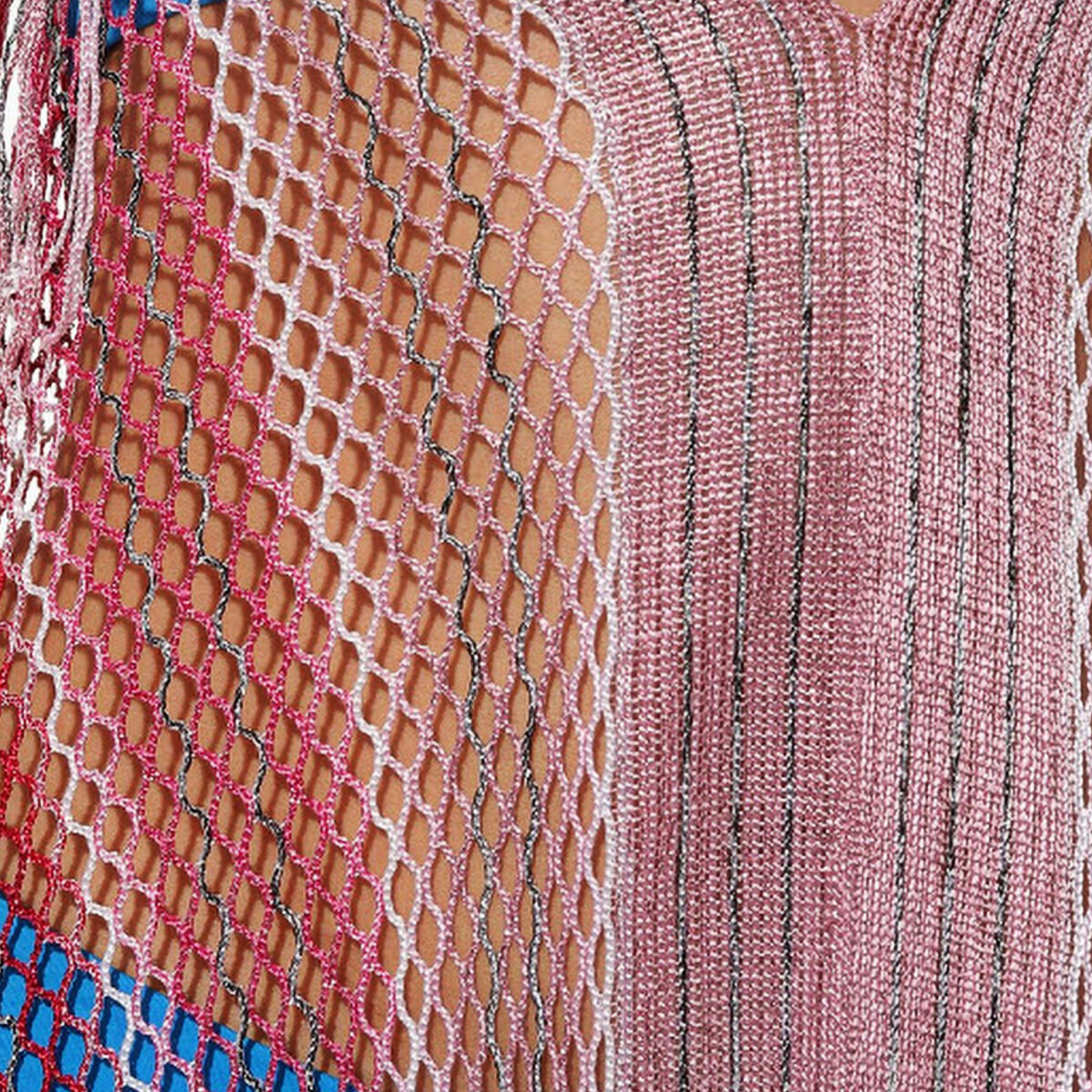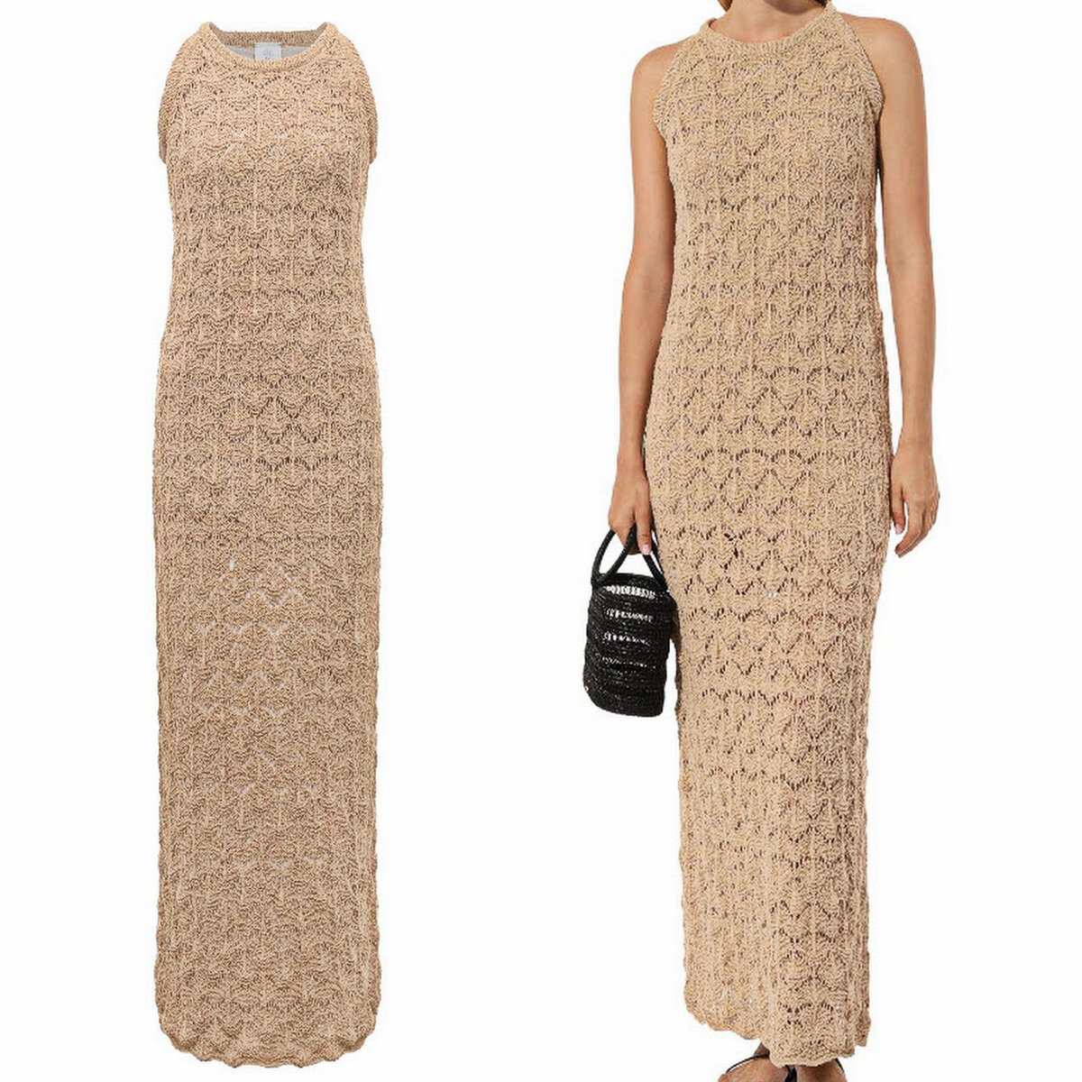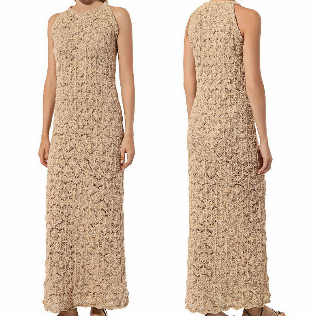 Мастера марки создали прямое платье из глянцевой шелковистой пряжи. Деликатное сияние нитей розового и золотистого цветов придало визуальный эффект объема вывязанному узору. Он зрительно моделирует силуэт, а акцент на ноги переносит длинная бахрома.