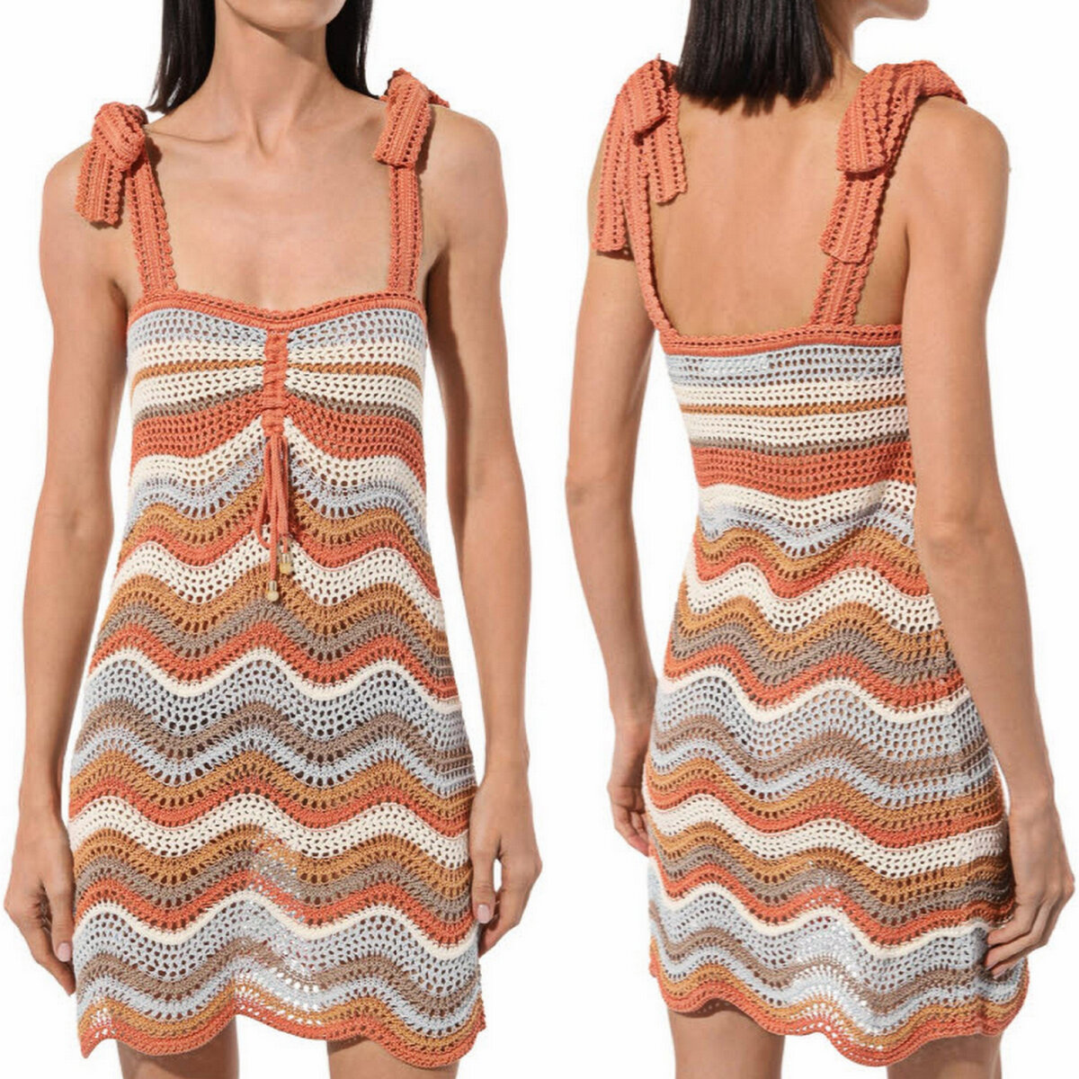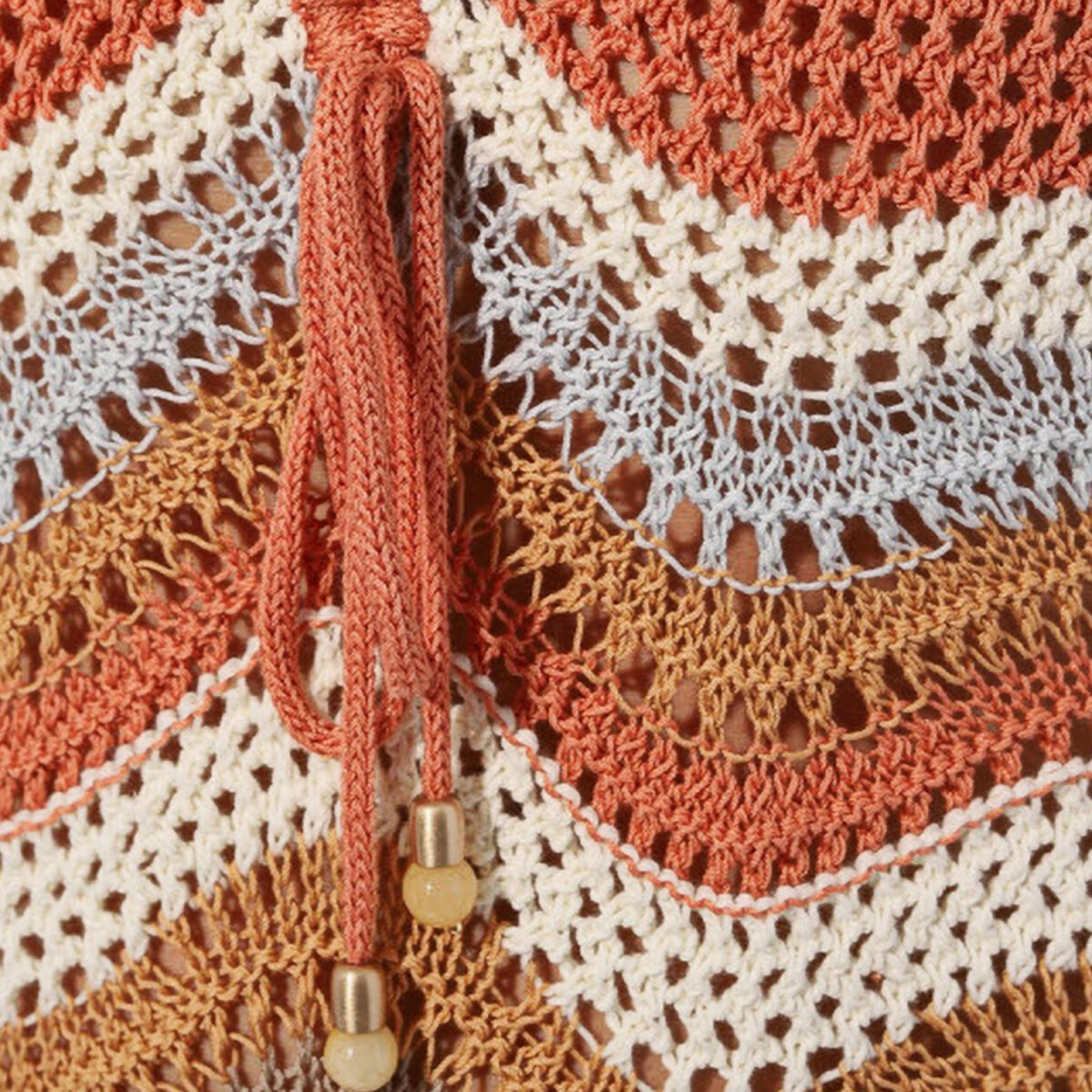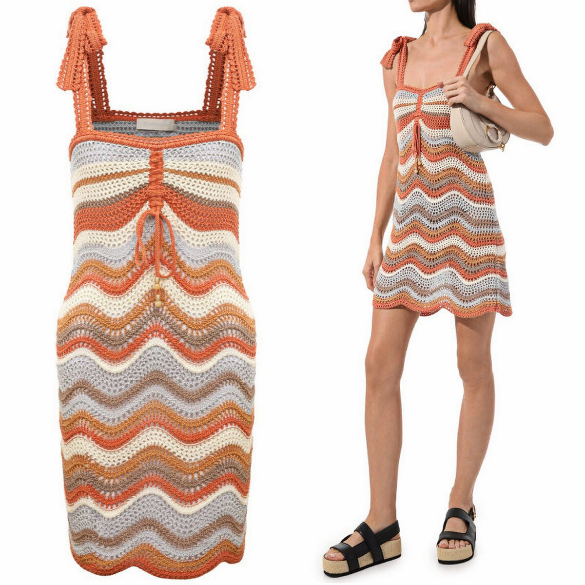 Разноцветное платье с волнообразным узором мастера марки выполнили ажурной вязкой, используя приятную на ощупь хлопковую пряжу. Линию декольте дополнили небольшой вертикальной кулиской с длинными шнурами. Глубина выреза регулируется широкими бретелями, которые можно завязать объемными бантами.