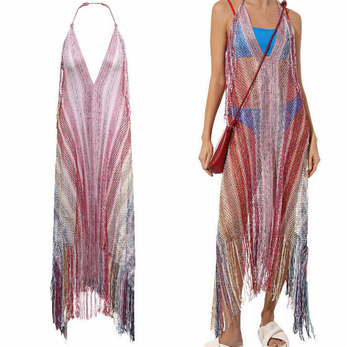 Длинное платье с вырезом халтер и открытой спиной – удачное дополнение пляжного образа. Для изготовления разноцветной модели с фирменным полосатым мотивом Анджела Миссони выбрала ажурную шелковистую сетку на основе нежной быстросохнущей вискозы. Бахрома на асимметричном подоле эффектно струится в движении, создавая летящий силуэт платья.
