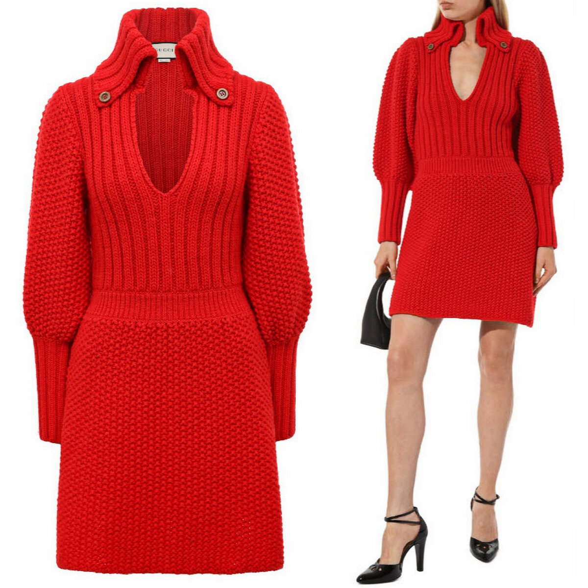 В огненно-красном платье из мягкой шерсти Алессандро Микеле зашифровал ссылки к костюмам эпохи Средневековья. Акцентный воротник дизайнер поддержал объемными рукавами, а подчеркнул выразительный силуэт узорами разной фактуры. На показе ассоциацию с придворными нарядами усилили, дополнив модель ботфортами и маской цвета бронзы, а наши стилисты рекомендуют носить ее с черными туфлями и сумкой.
