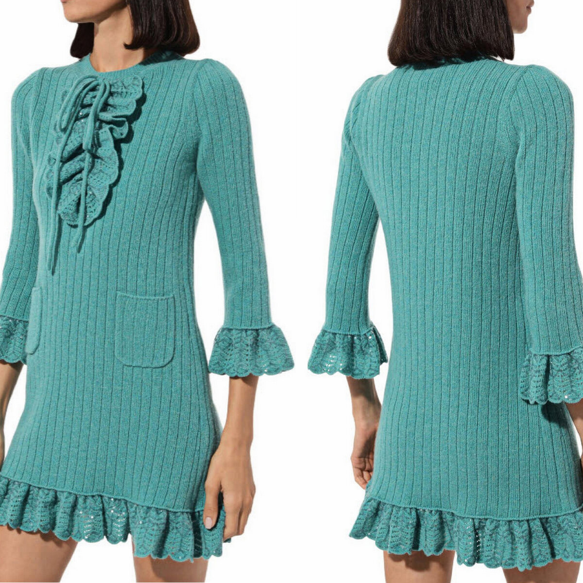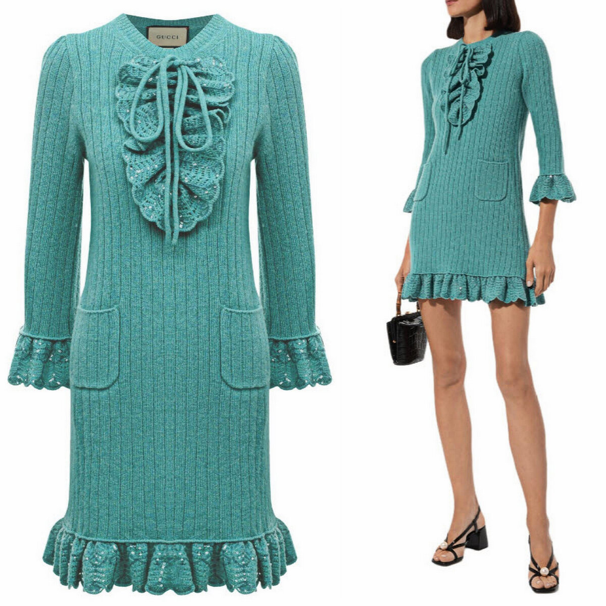 Дизайн бирюзового короткого платья с двумя карманами и рукавами 3/4 словно вдохновлен моделями викторианской эпохи. Сходство читается в скульптурном жабо и ажурных оборках на манжетах и подоле. Для создания облегающего изделия с накладными карманами мастера марки использовали фактурный эластичный трикотаж из мягкой шерсти.