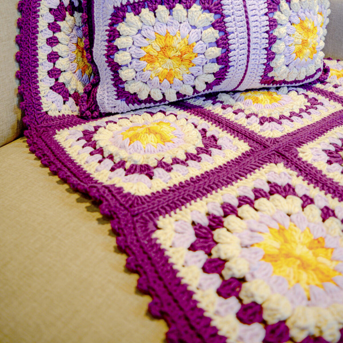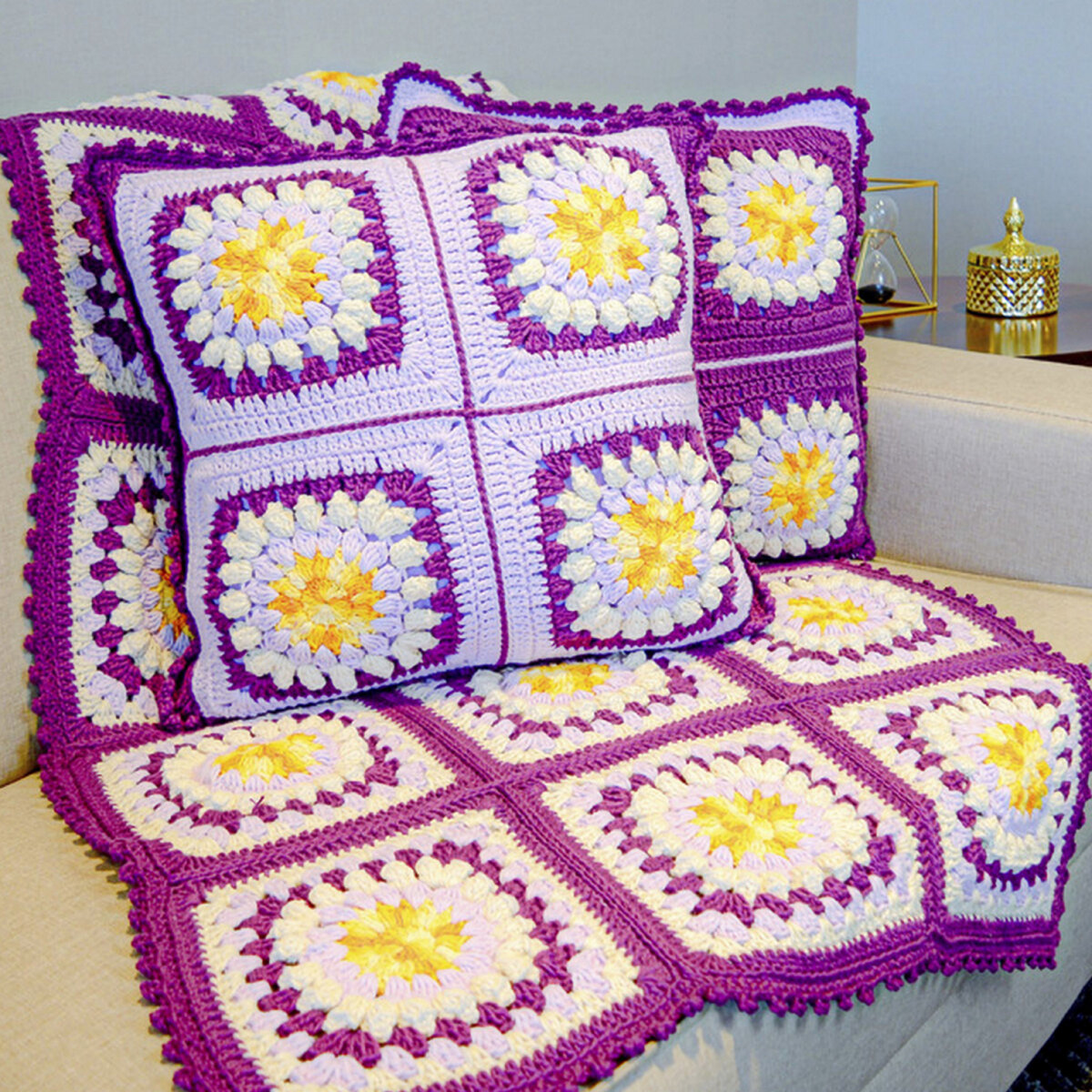 Нарядный комплект — подушка и плед в жёлто-сиренево-белых тонах. Как цветочная поляна с фиалками и ромашками (или, скорее, календулами).