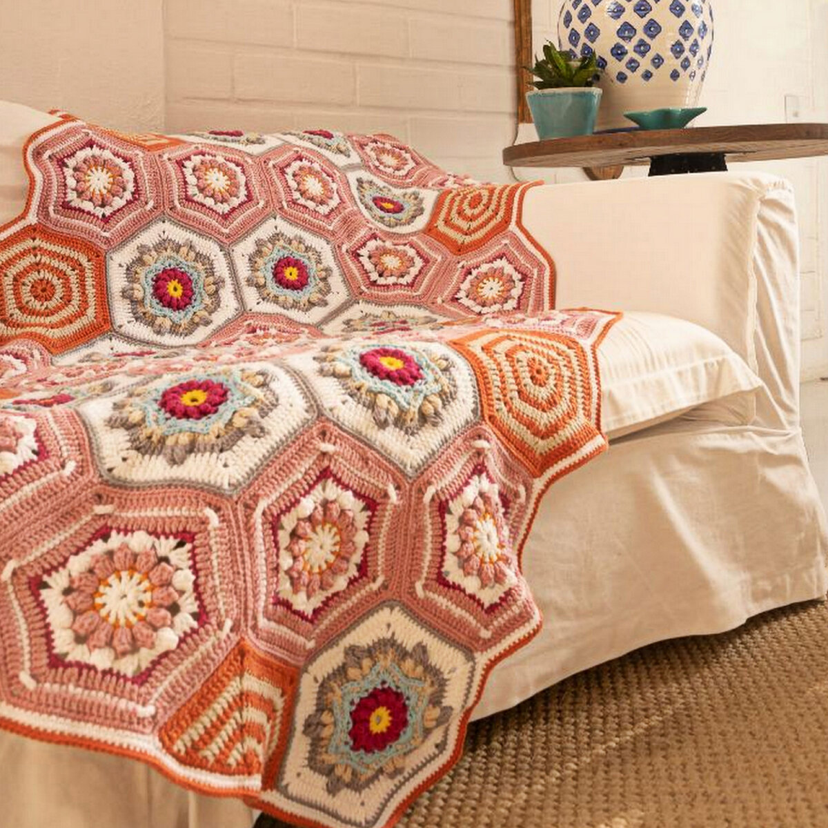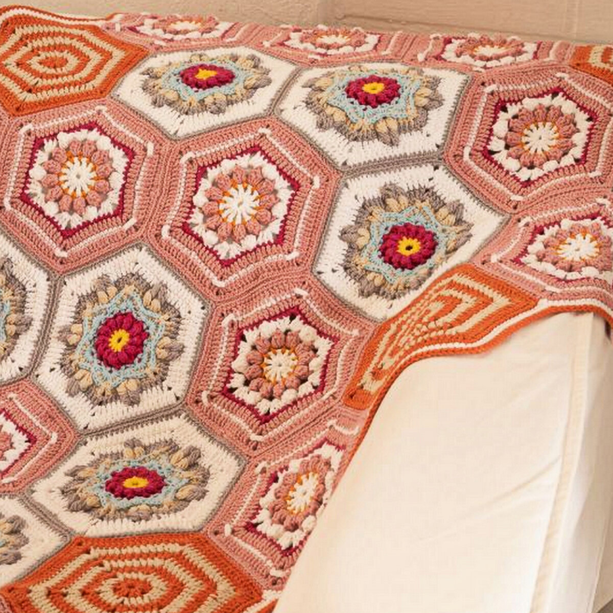 Прелестный карамельный плед в восточном стиле, связанный из двух шестигранников — сочетание бабушкиного квадрата и цветочных мотивов. Эффектная модель не для новичка в вязании, но оно того стоит! А ещё это отличный способ пристроить остатки цветной пряжи.