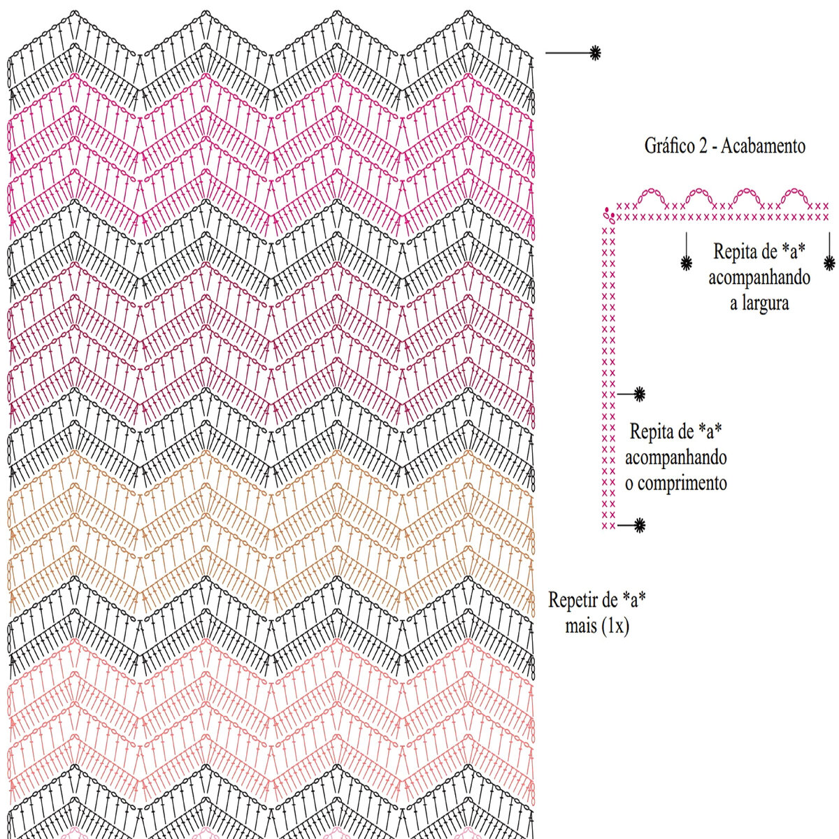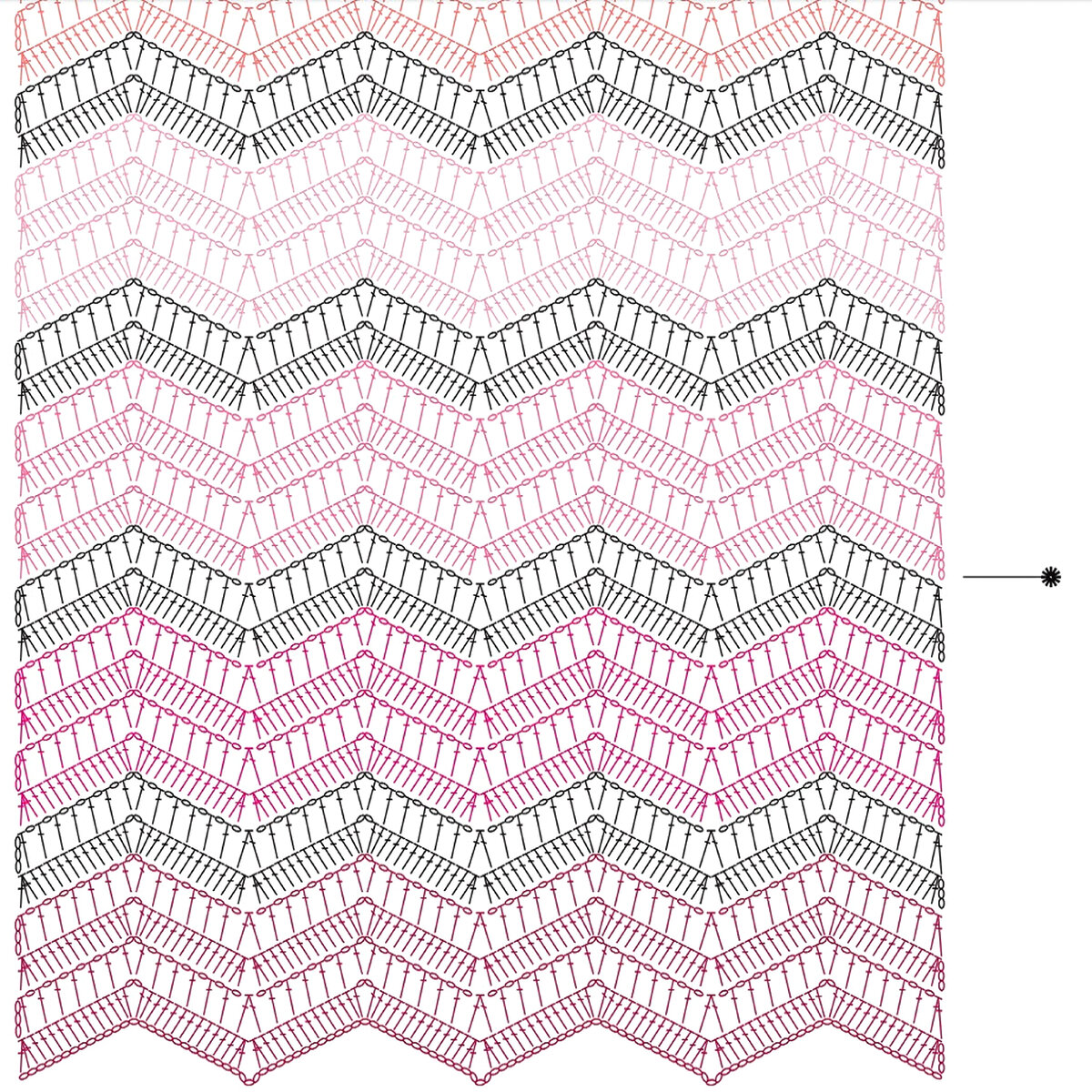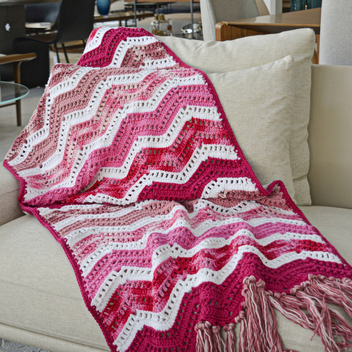 Узкий плед с узором «зигзаги» — приятное сочетание розовых оттенков и белой пряжи. Плед украшен густой бахромой.