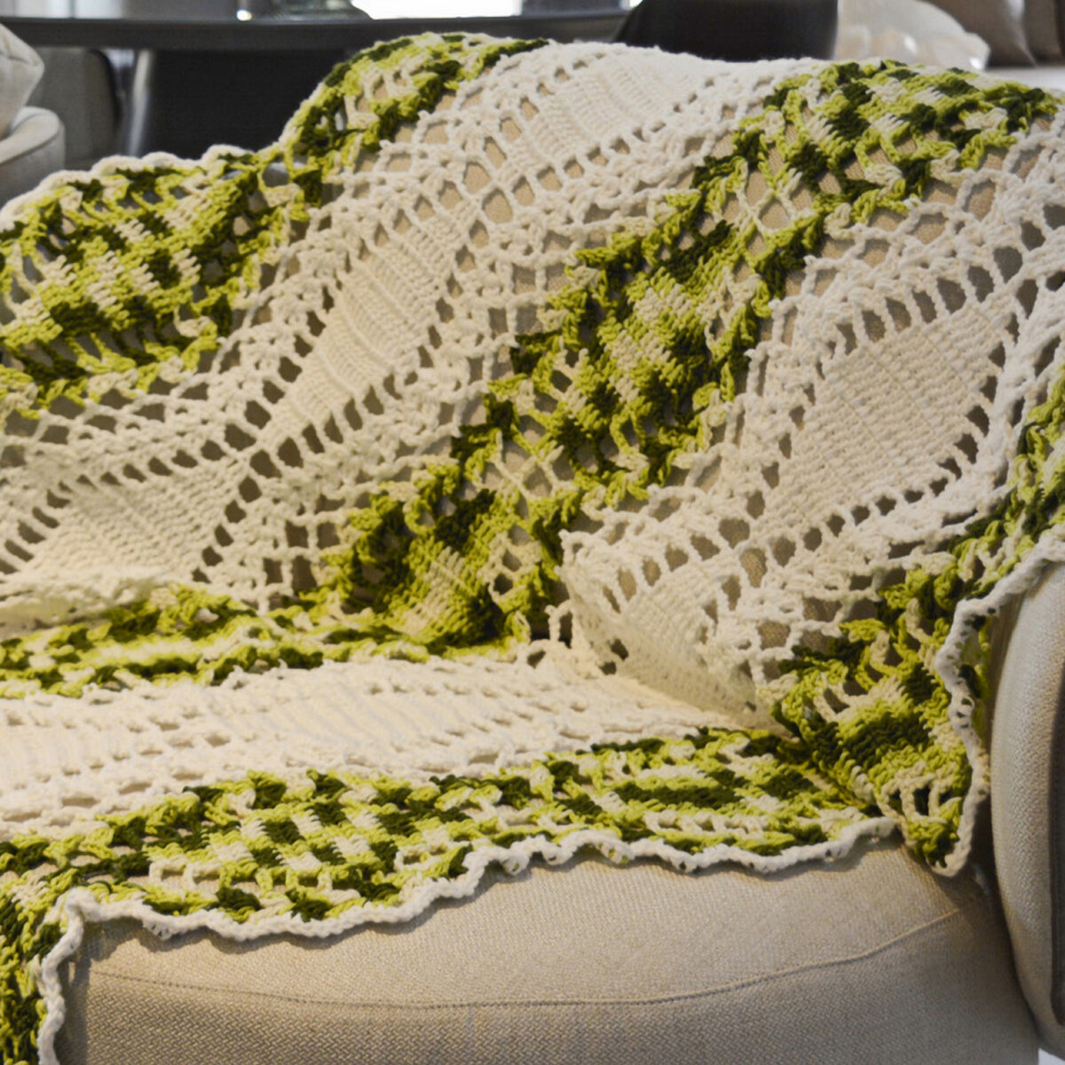 Симпатичный плед с крупными ажурными ромбами — чередование вертикальных полос белого цвета и салатово-зелёного меланжа. Оригинальная бахрома из воздушных цепочек по краю.