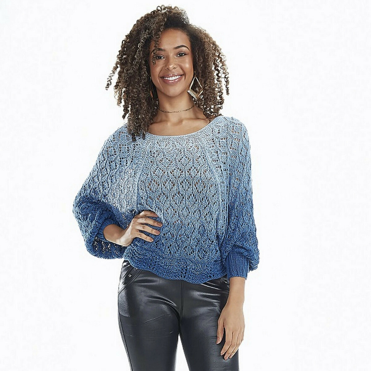 Оригинальный джемпер спицами с широкими рукавами а-ля «летучая мышь». Эффектная женская модель спицами с красивым переходом цвета в сине-голубой гамме.