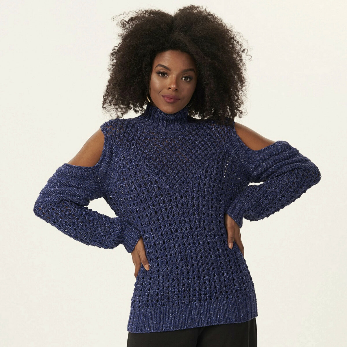 Эффектный свитер спицами с открытыми плечами. Свободный крой, широкие рукава с присборкой и простые сетчатые узоры спицами. Оригинальная модель, которая одинаково хорошо будет смотреться и со строгими брюками, и с протёртыми джинсами. А немного искрящегося люрекса придаёт свитеру особую нарядность.