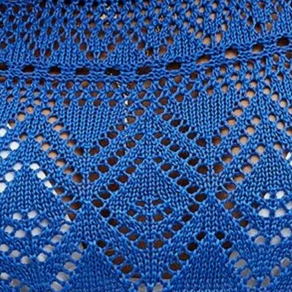 Укороченный васильковый топ спицами с непростым, но очень эффектным ажурным узором. Отличный вариант на лето от китайского бренда Shein. Если не носите такие кроп-топы, можно связать длиннее.