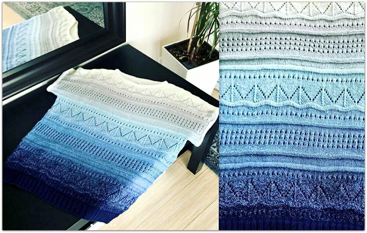 Эффектная футболка с сочным градиентным переходом от@om.knitting, словно волнующееся море на фоне безоблачного неба. Связана по мотивам свитера от Изабель Маран, о котором я когда-то давно писала.