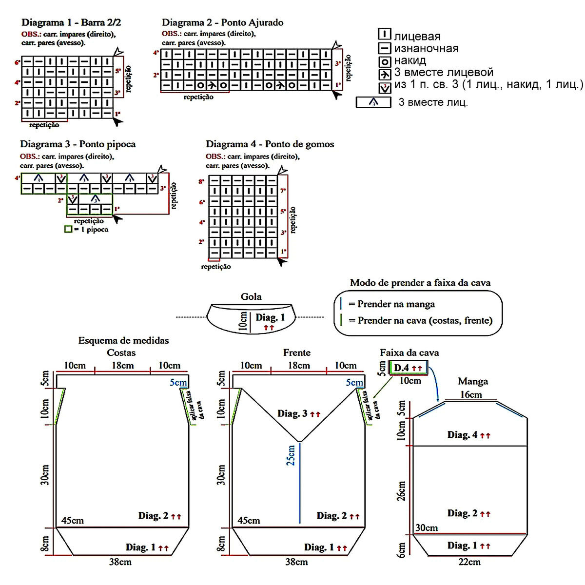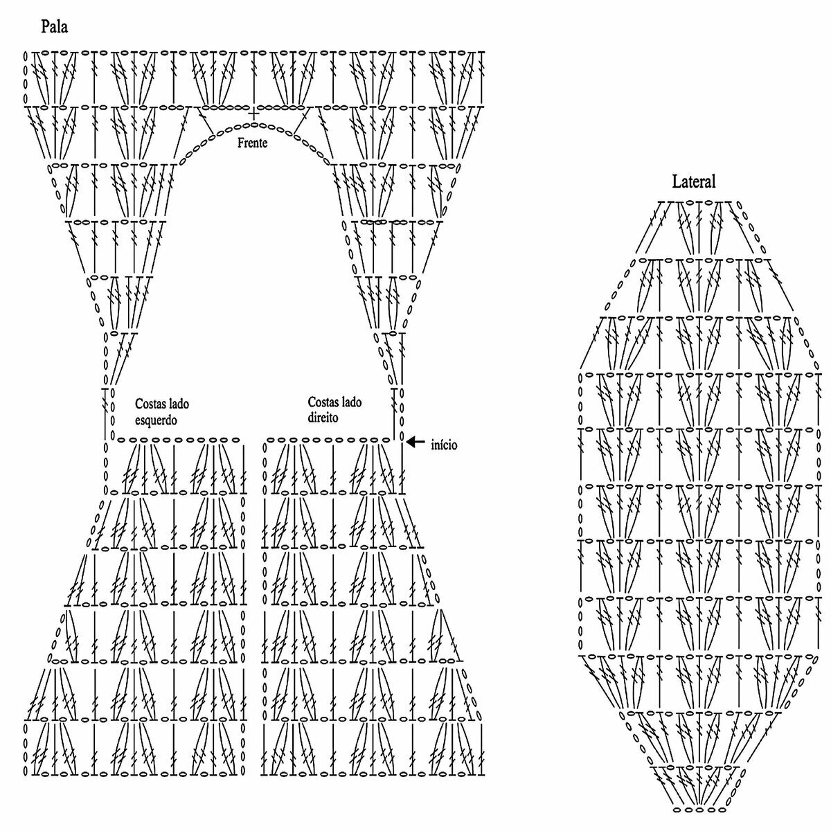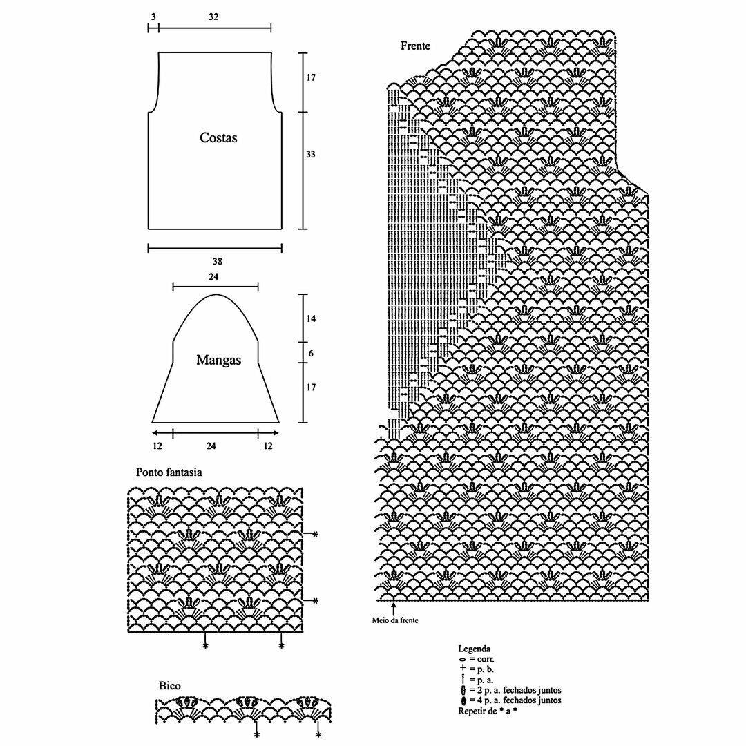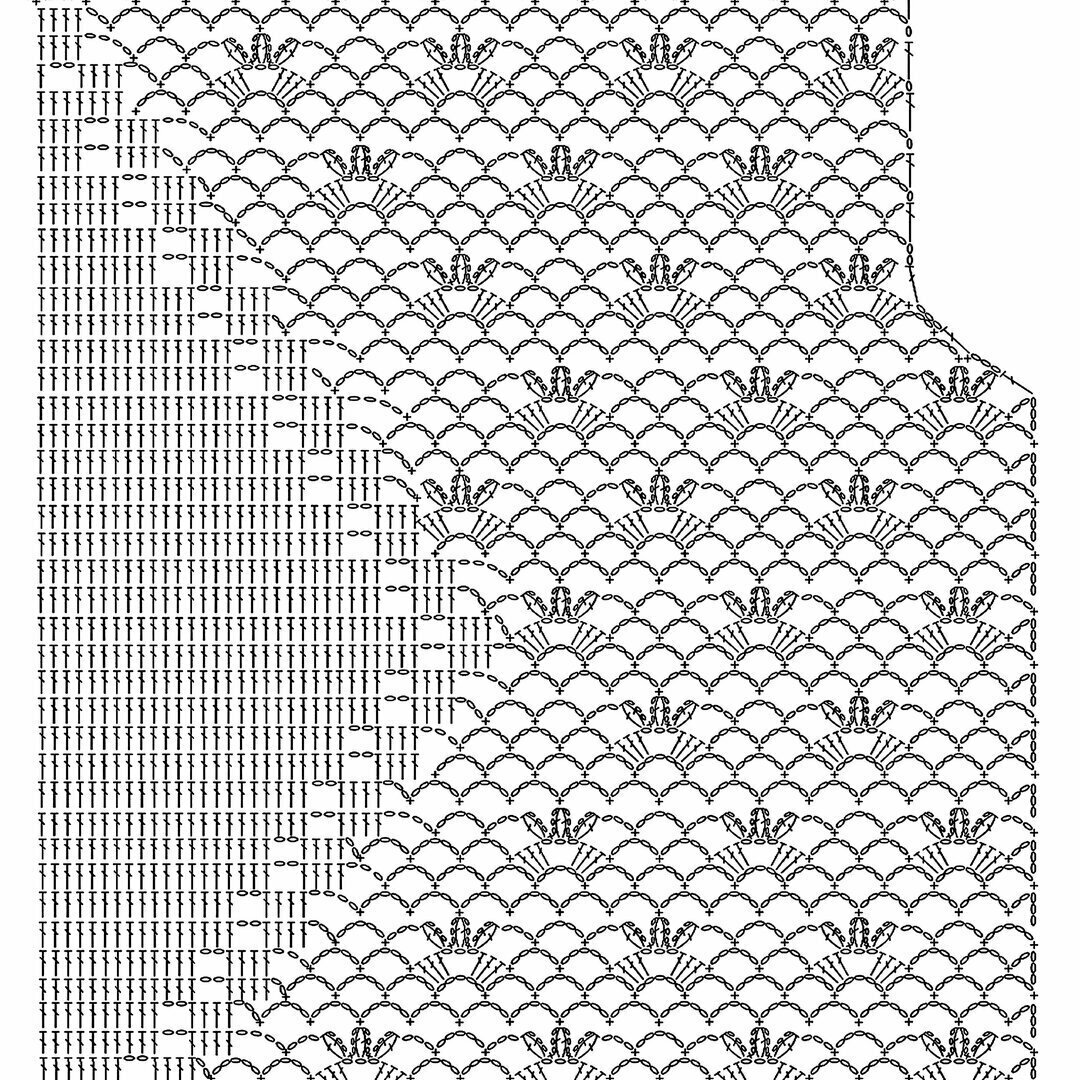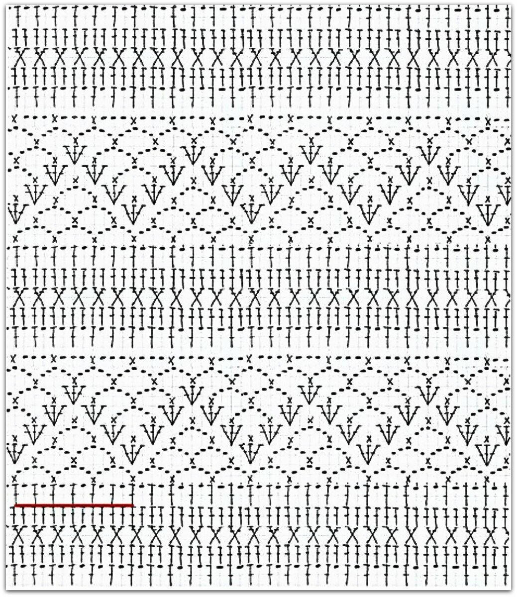 Отрывок этого ажурного узора у нас ещё будет идти вверху на спинке топа и впереди по плечикам (после ажурного узора № 2) — с 1-го по 17-й ряды. А также на рукавах — с 21-го по 41-й ряды.