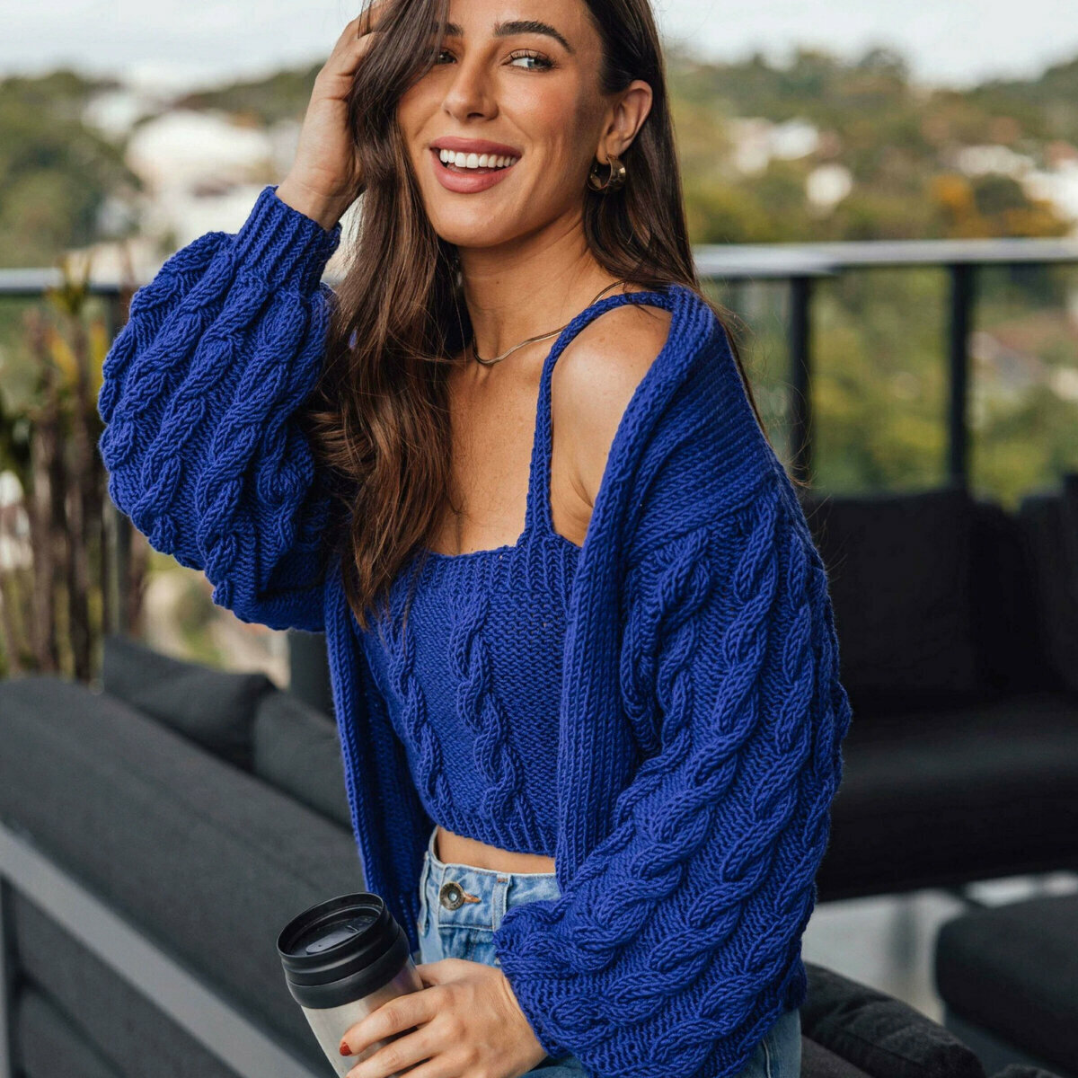 Ярко-синий комплект-двойка спицами для яркой и уверенной в себе девушки!