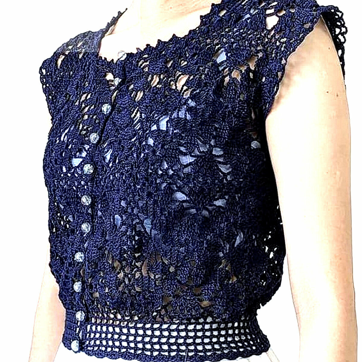 Простая, но от этого не менее эффектная, блузка-безрукавка крючком насыщенного тёмно-синего цвета.