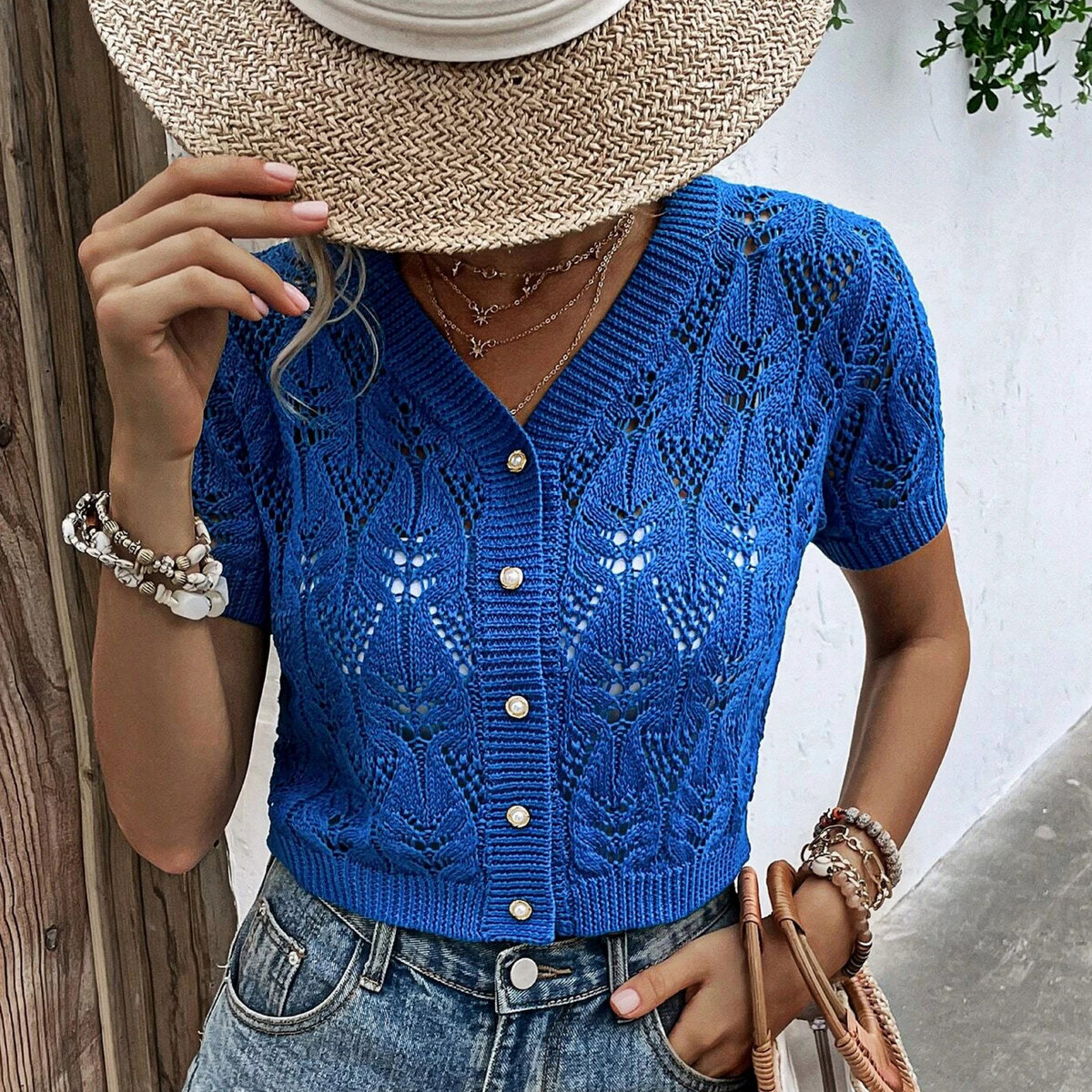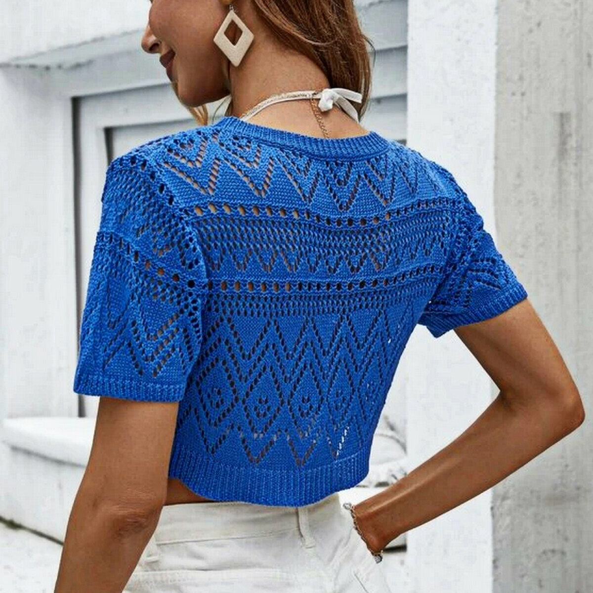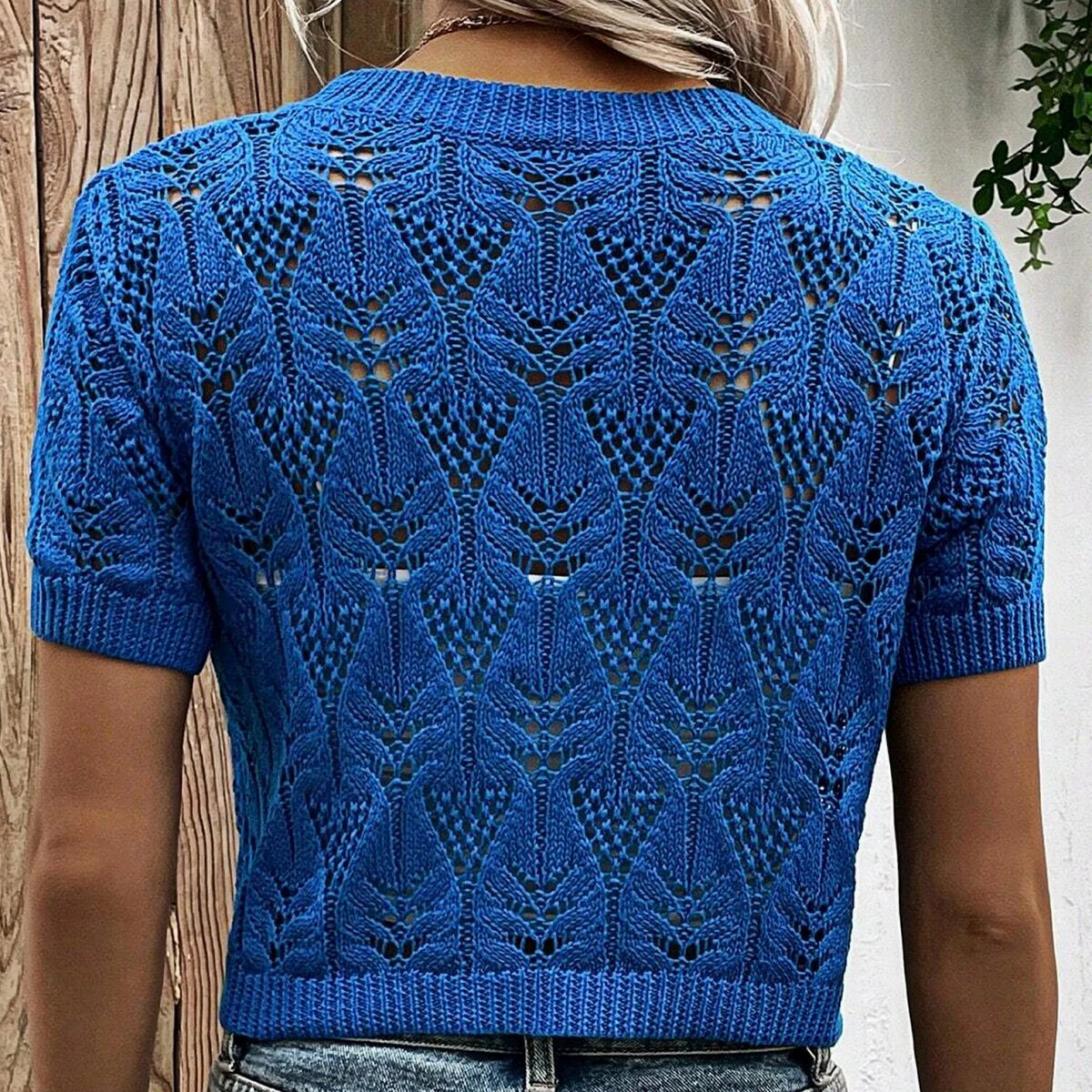 Стильный синий кроп-топ спицами от Shein. Чудесная летняя модель для истинных модниц! Разнообразие несложных ажурных узоров и простой прямой крой. Длина топа выше талии, короткий втачной рукавчик и круглый вырез горловины.