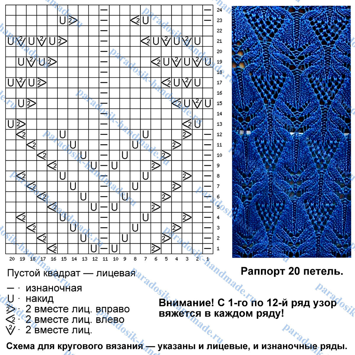Раппорт узора 20 петель и 24 ряда в высоту. Схема для кругового вязания — указаны и лицевые (нечётные), и изнаночные (чётные) ряды. Обратите особое внимание, что с 1-го по 12-й ряд узор вяжется в каждом ряду, с 13-го по 24-й ряд изнаночные (чётные) ряды можно вязать по рисунку.