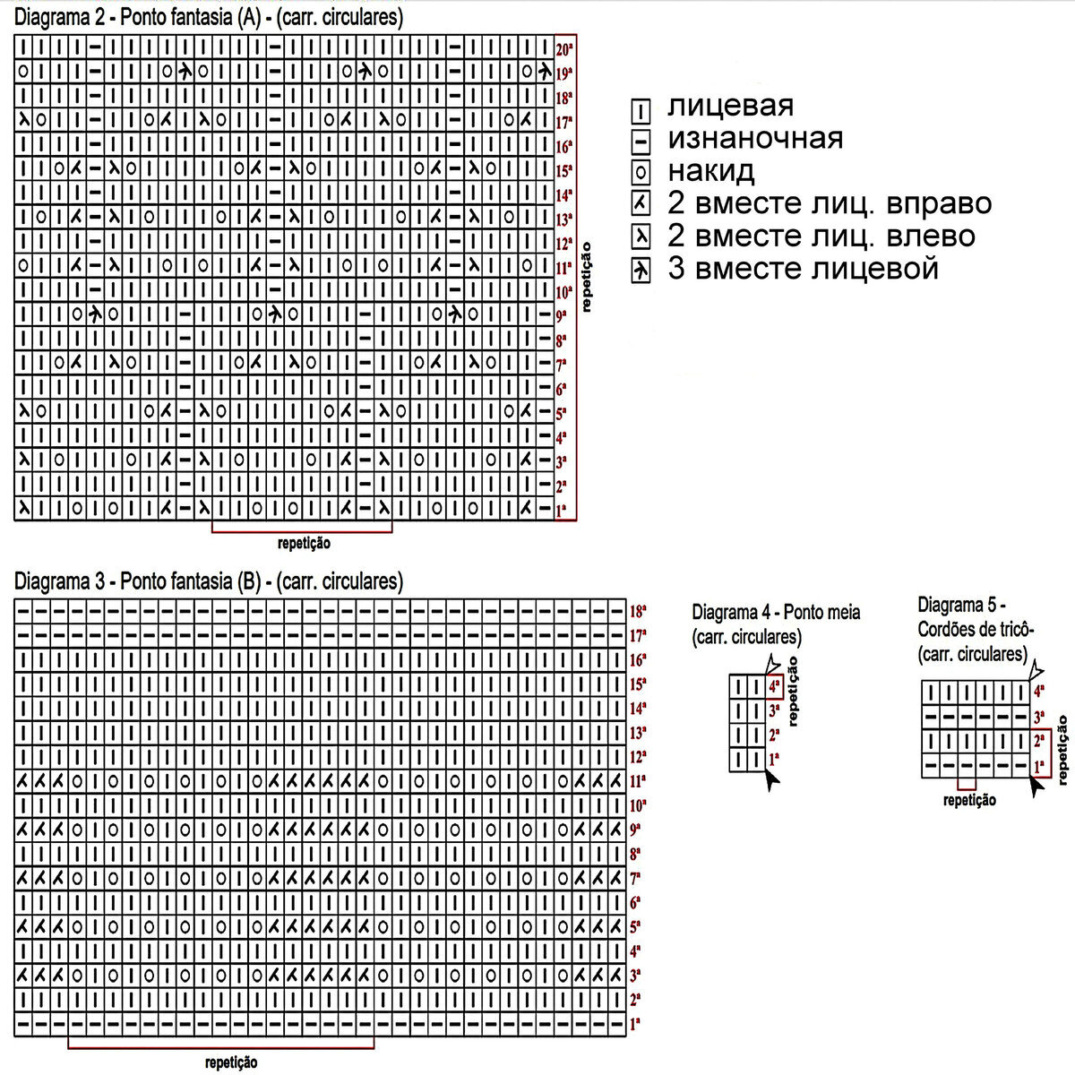 Внимание! Для поворотного вязания необходимо будет добавить ещё одну петлю к общему количеству раппортов и в 29-м, 35-м и 41-м рядах начинать вязание не с «3 вместе лиц.», а с «2 вместе лиц.», заканчивая ряд также «2 вместе лиц.» (всё остальное строго по схеме). Если этого не сделать — весь рисунок «поедет». Для кругового вязания ничего добавлять не нужно и просто вязать по схеме!