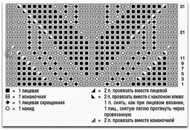 Раппорт узора 8 петель и 34 ряда в высоту. На схеме указаны только лицевые (нечётные) ряды, изнаночные (чётные) вязать по рисунку.
