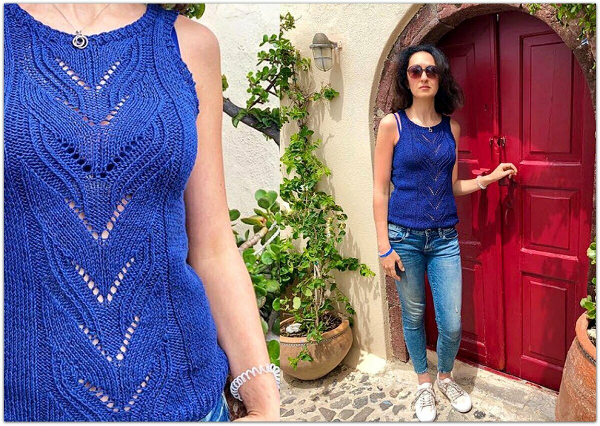 Оригинальное сочетание объёмных жгутов и крупной сетки из спущенных петель делает эту синюю маечку спицами особенно эффектной и стильной.