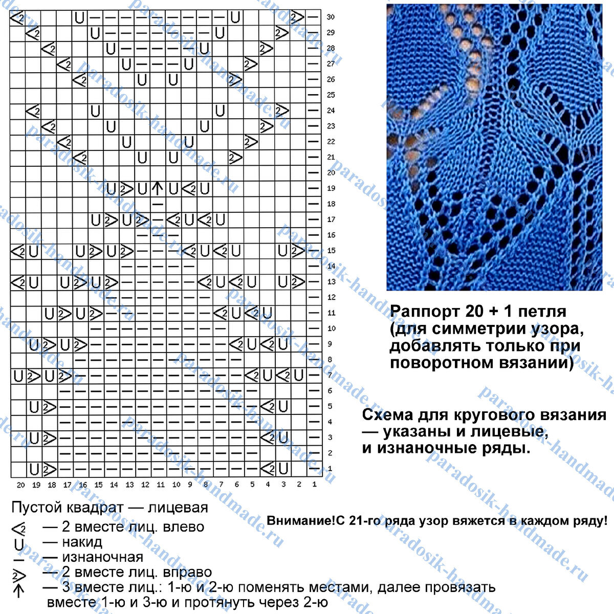 Раппорт узора 20 петель и 30 рядов в высоту. Схема для кругового вязания — указаны и лицевые, и изнаночные ряды. Обратите внимание, что до 20-го ряда узор вяжется только в лицевых рядах (в изнаночных провязываем по рисунку), а с 21-го ряда — уже и в лицевых, и в изнаночных рядах.