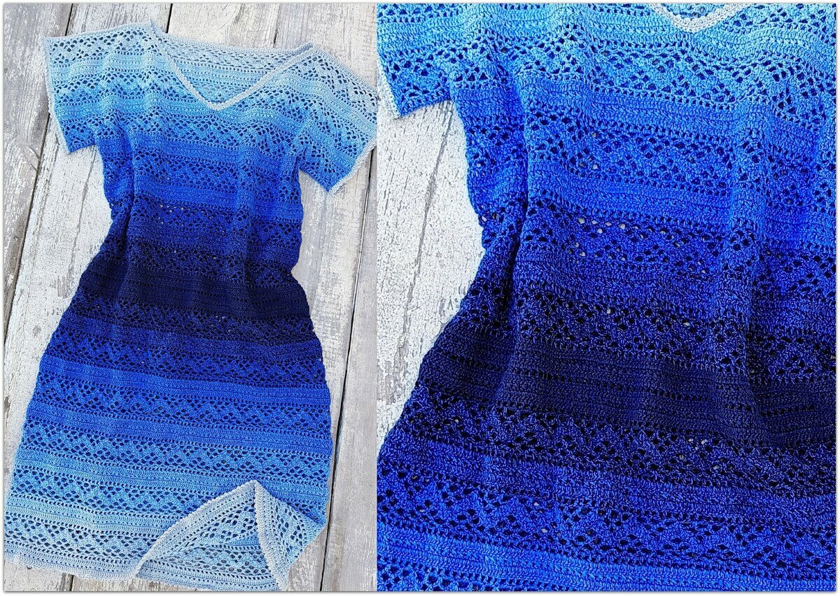 Эффектное платье крючком в сине-голубой гамме. Не совсем простой вариант для новичка, но и не самый сложный. А вся прелесть этого платья даже не в узоре, как таковом, а в правильно подобранной пряже.