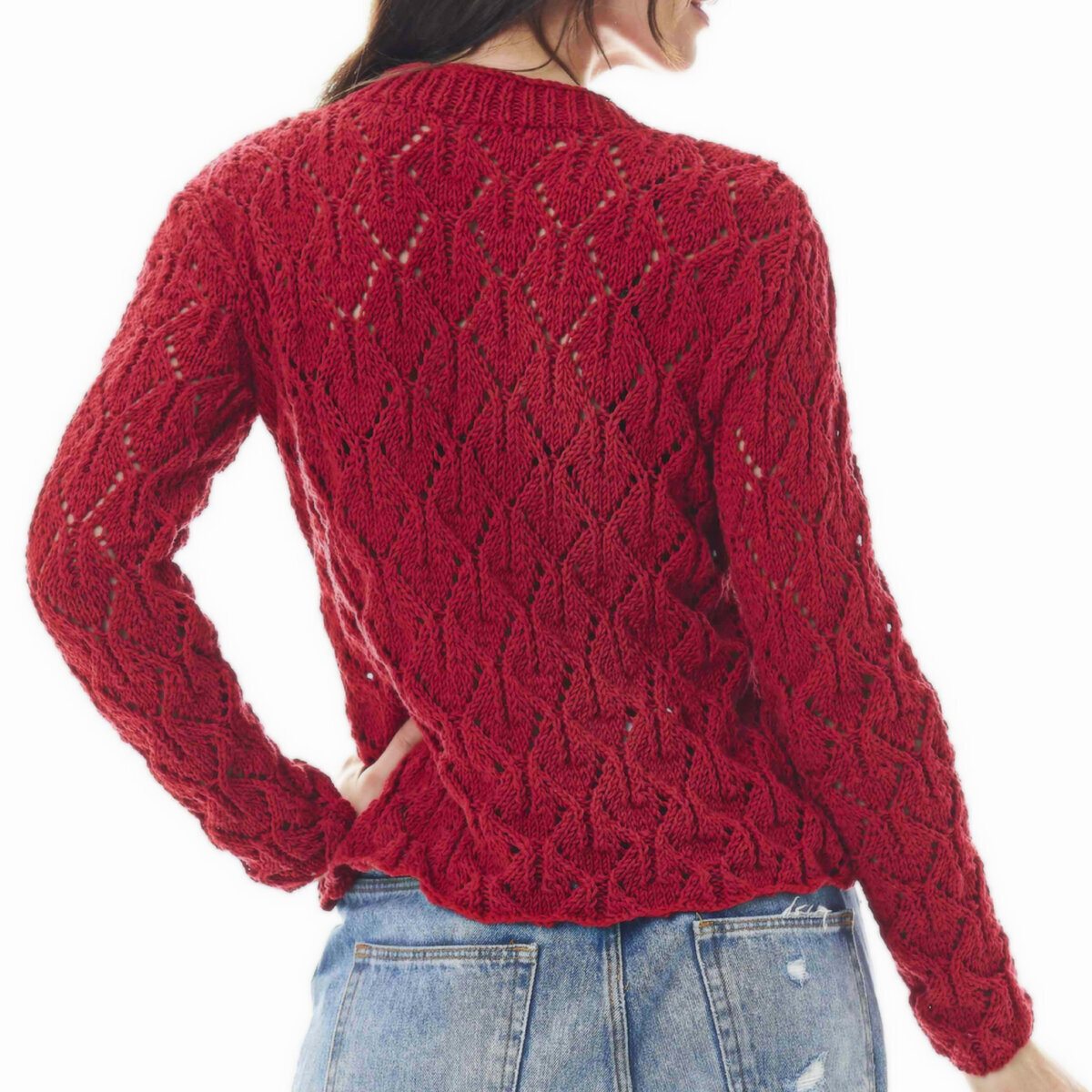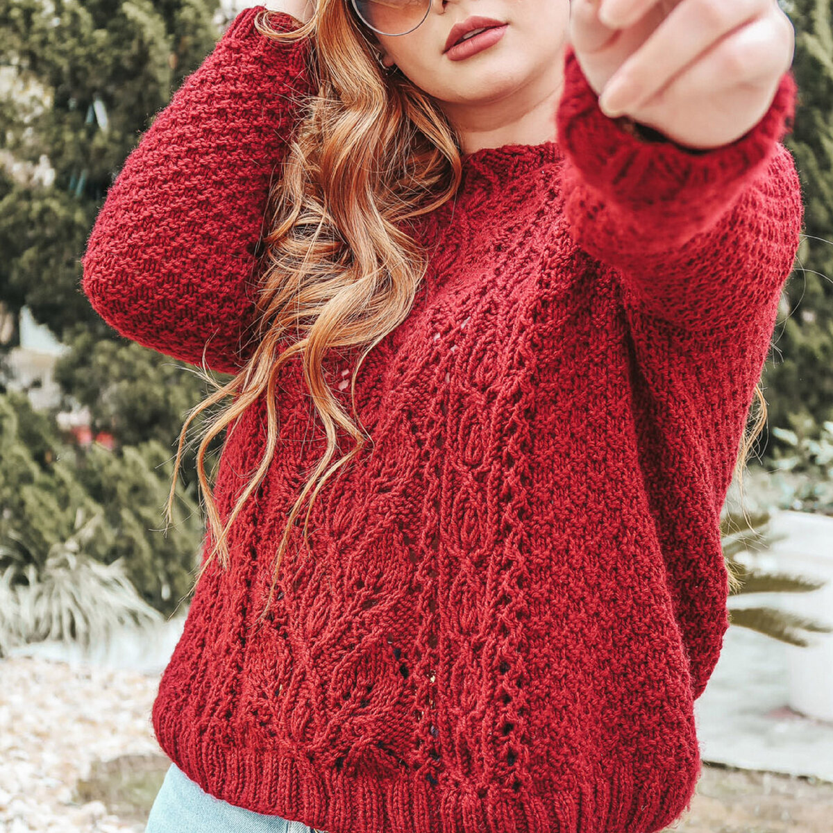 Роскошный рубиновый свитер спицами с лиственным узором по центру и простой шахматкой из лицевых и изнаночных петель на рукавах и спинке. Стильная модель прямого фасона с зауженными рукавчиками.