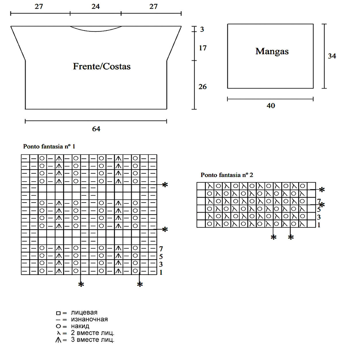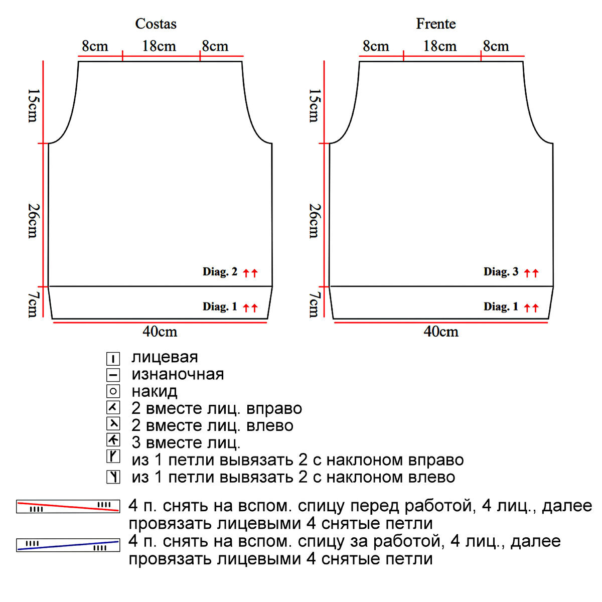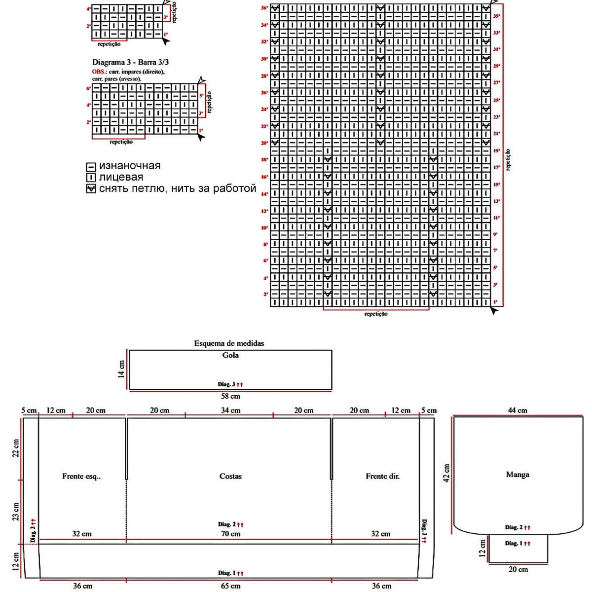 Друзья, будьте внимательны! В оригинальной схеме есть ошибка или, вернее, недочёт — пустой квадрат в условных обозначениях идёт как изнаночная петля, но это обозначение верно не для всей схемы! Если посмотреть внимательно на изделие, то в ажурном узоре с косами пустой квадрат идёт как лицевая петля. Я уточнила этот момент в расшифровке и выделила узор красным (этот же узор идёт на схеме для рукавов и там все пустые квадраты обозначают лицевую петлю).