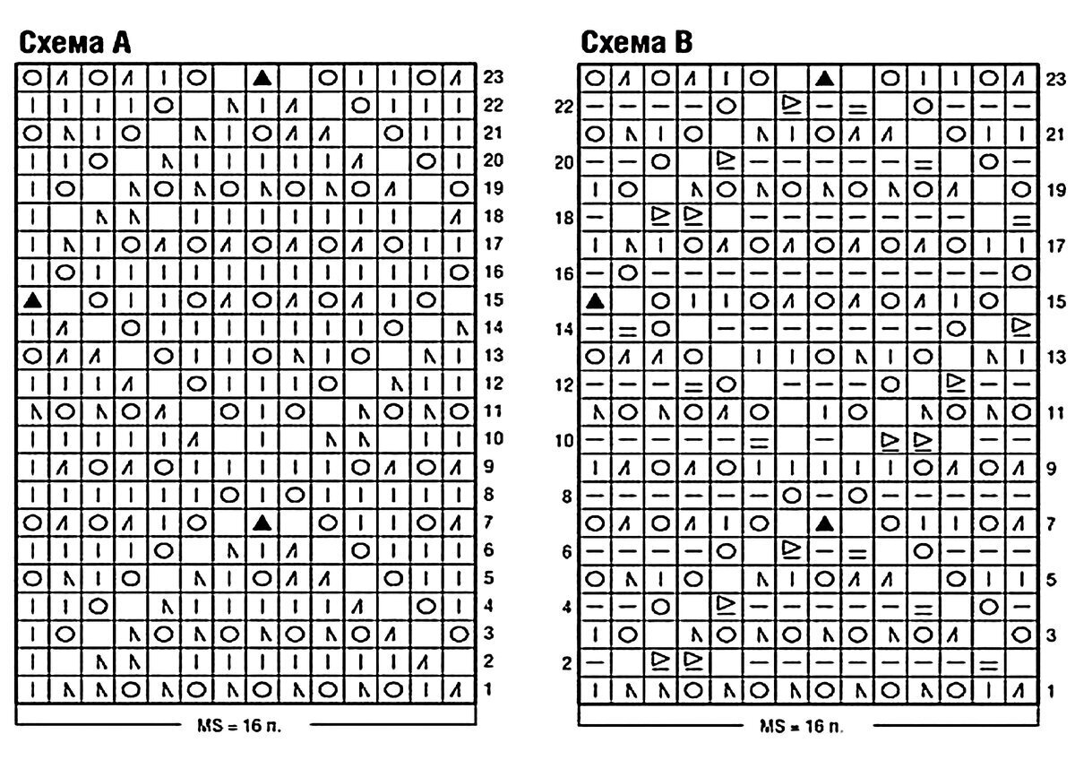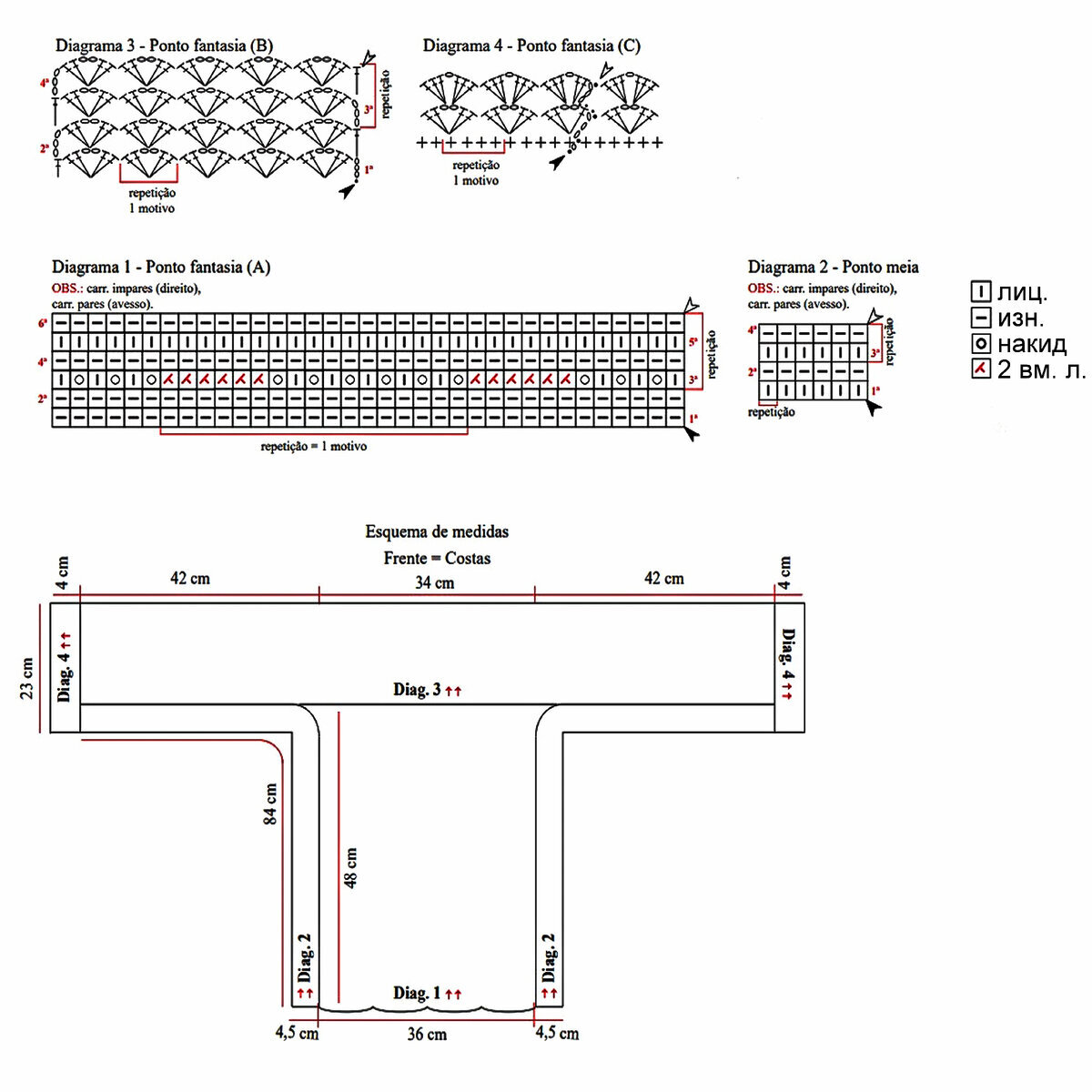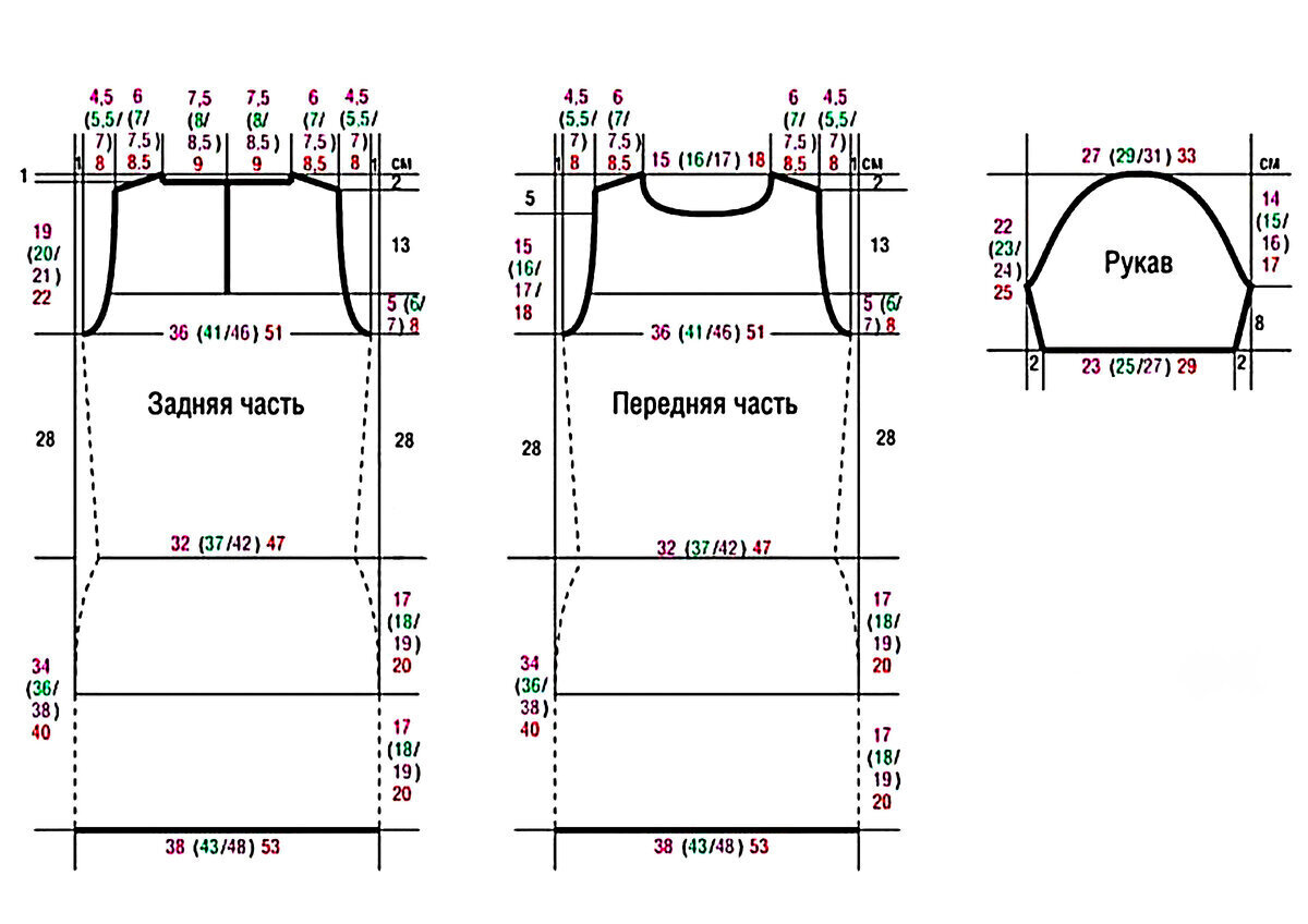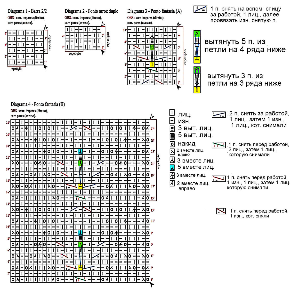Друзья, будьте внимательны! В оригинальной схеме есть ошибка или, вернее, недочёт — пустой квадрат в условных обозначениях идёт как изнаночная петля, но это обозначение верно не для всей схемы! Если посмотреть внимательно на изделие, то в ажурном узоре с косами пустой квадрат идёт как лицевая петля. Я уточнила этот момент в расшифровке и выделила узор красным (этот же узор идёт на схеме для рукавов и там все пустые квадраты обозначают лицевую петлю).