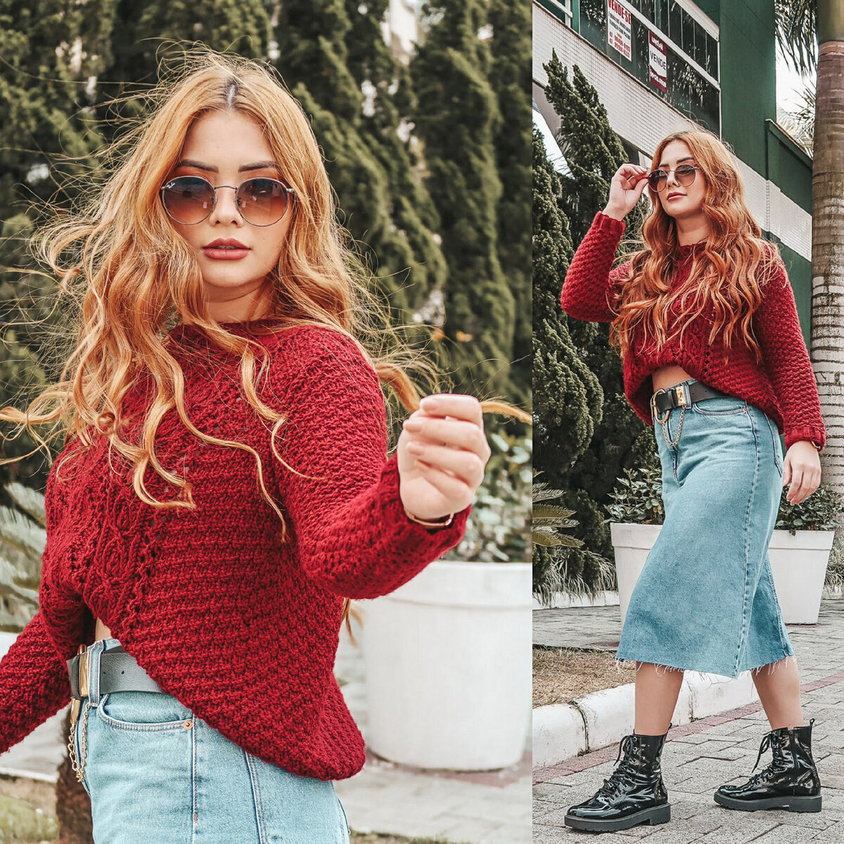Вишнёвый кроп-джемпер спицами в спортивном стиле. Укороченный фасон выше талии, слегка спущенная линия плеча, длинные зауженные рукава, вырез лодочкой.