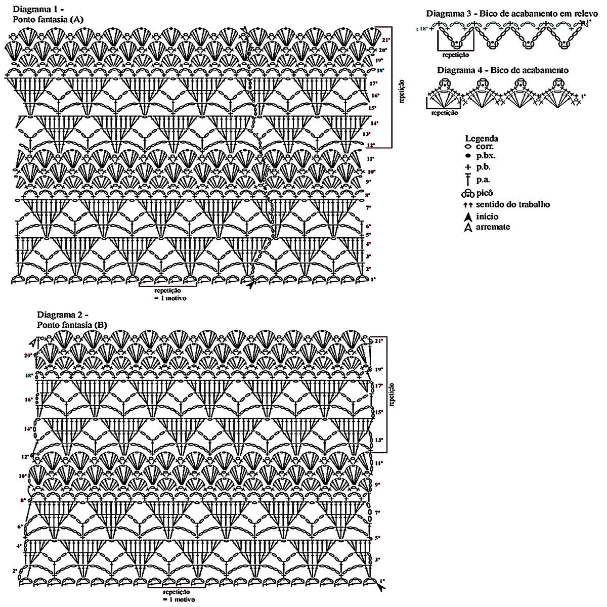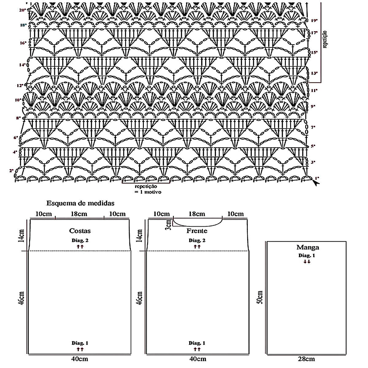 Ещё один роскошный топ крючком — оригинальное чередование мелких цветочных мотивов и волнистых полос из брумстиков. Прямой фасон, рукава-крылышки и необычный вырез горловины, который получается благодаря узору из брумстиков.