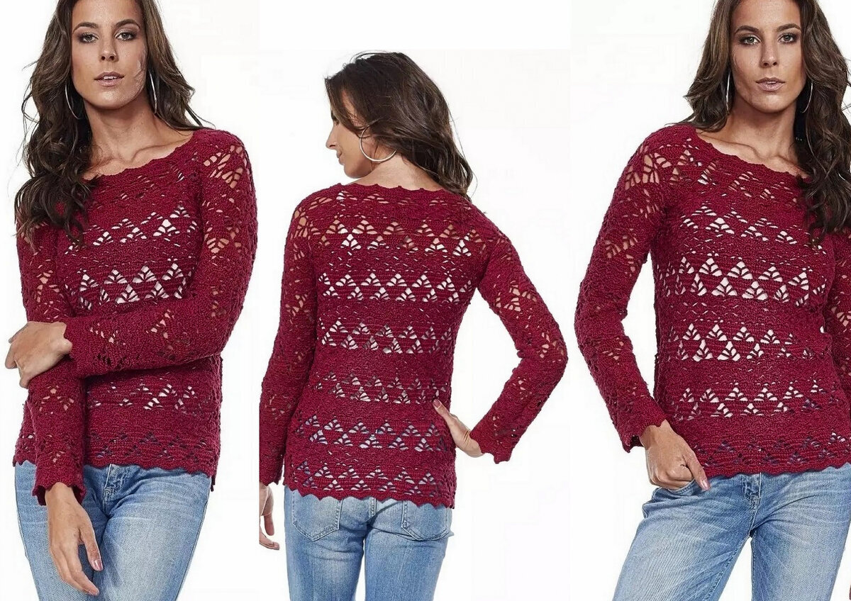 Этот джемпер крючком наряден уже сам по себе, благодаря яркому и насыщенному цвету. А красивый ажурный узор лишь добавляет ему праздничности — в таком джемпере точно не останетесь незамеченными!