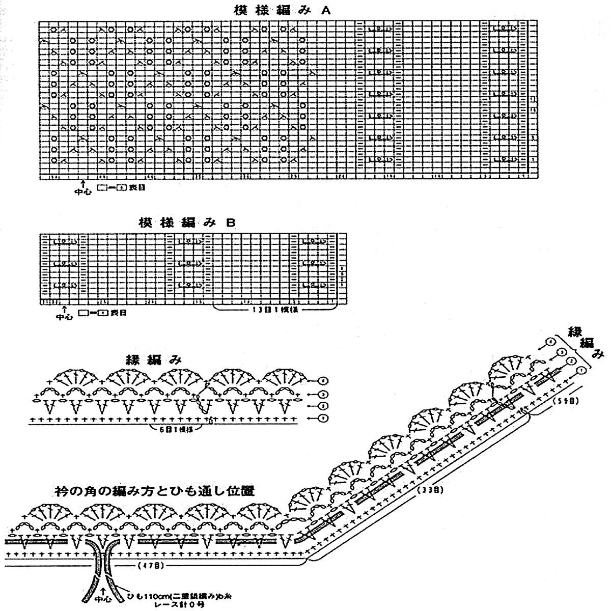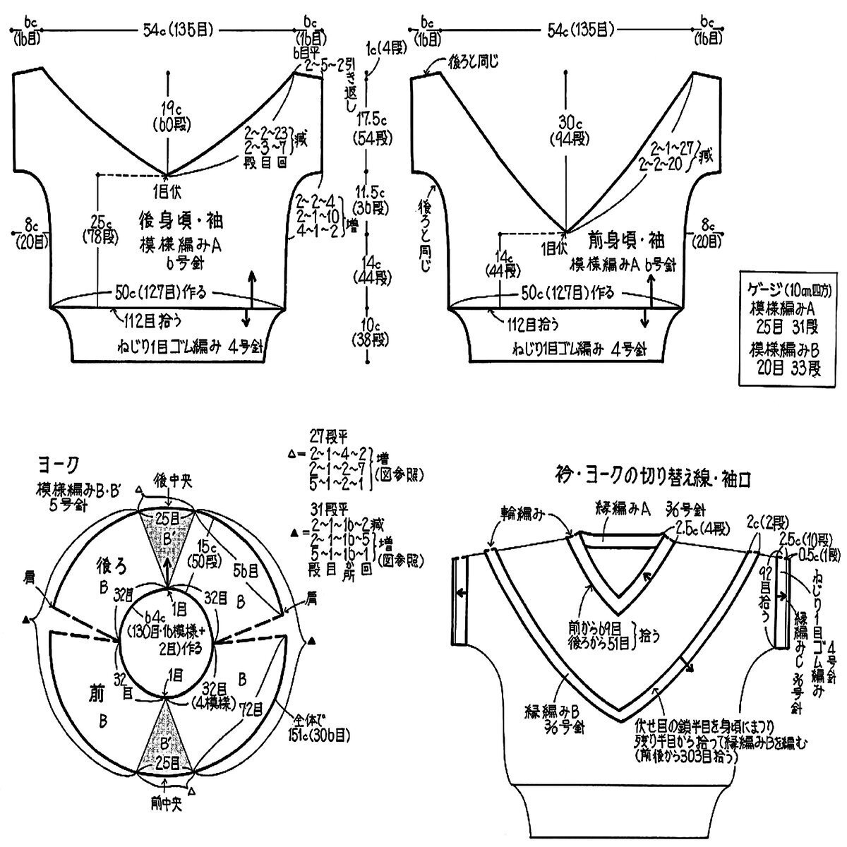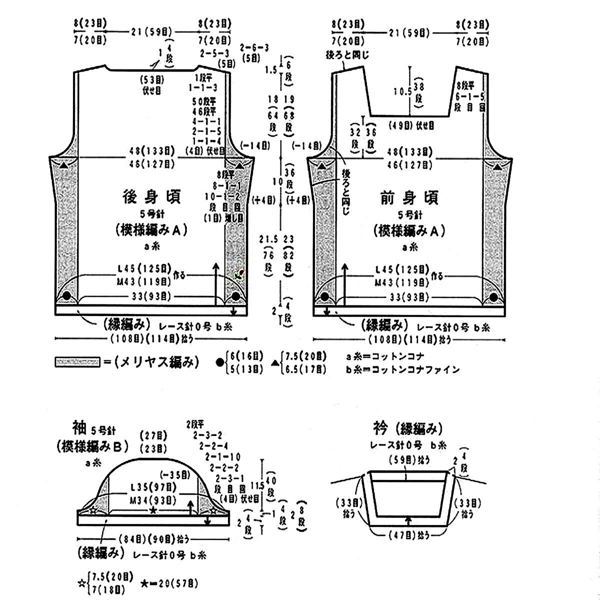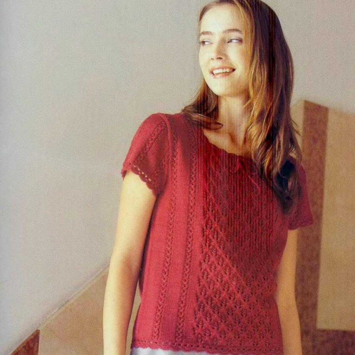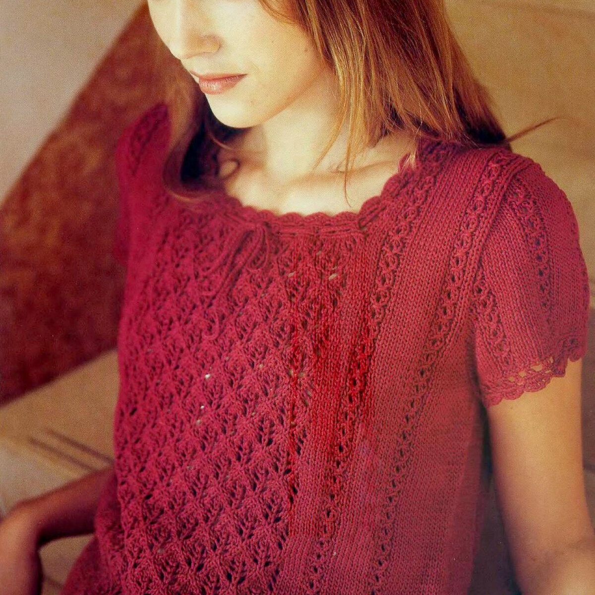 Пожалуй, это самый простой японский топ, здесь минимум ажурных узоров и они совсем несложные, прямой фасон и небольшой втачной рукавчик. Нет фото того, как вяжется спинка, но, думаю, её можно связать просто лицевой гладью или добавить по бокам такие же ажурные дорожки, как впереди — этого будет достаточно.
