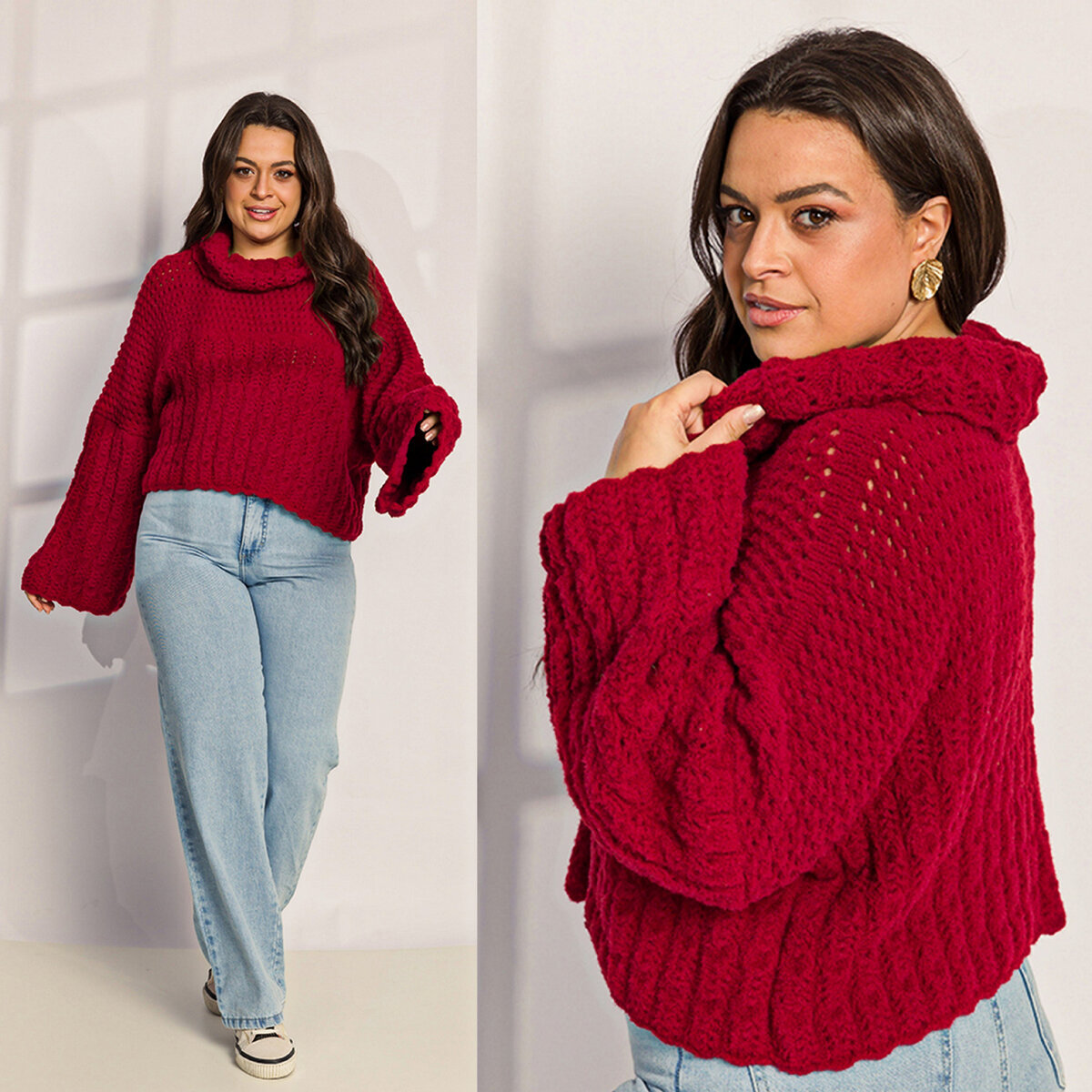 Свитер спицами с широким воротом-хомутом и длинными рукавами а-ля клёш. Модель оверсайз, прямой фасон до пояса, сильно спущенная линия плеча, широкие рукава.
