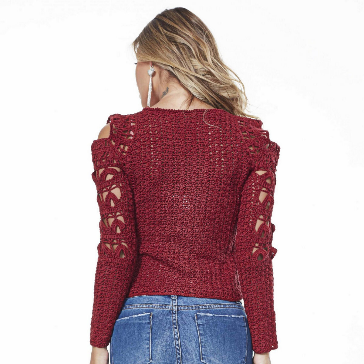 Джемпер крючком с оригинальными кружевными рукавами и вырезами по плечикам. Прямой фасон до талии, длинные узкие рукава и небольшой вырез лодочкой.