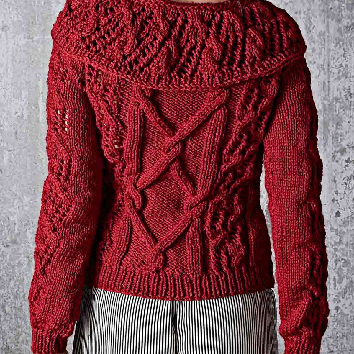 Шикарный свитер спицами с большим отложным воротником. Оригинальная плетёнка по центру и ажур с косами по бокам. Прямой фасон до пояса, втачной рукав, вырез лодочкой и широкий отложной ворот.