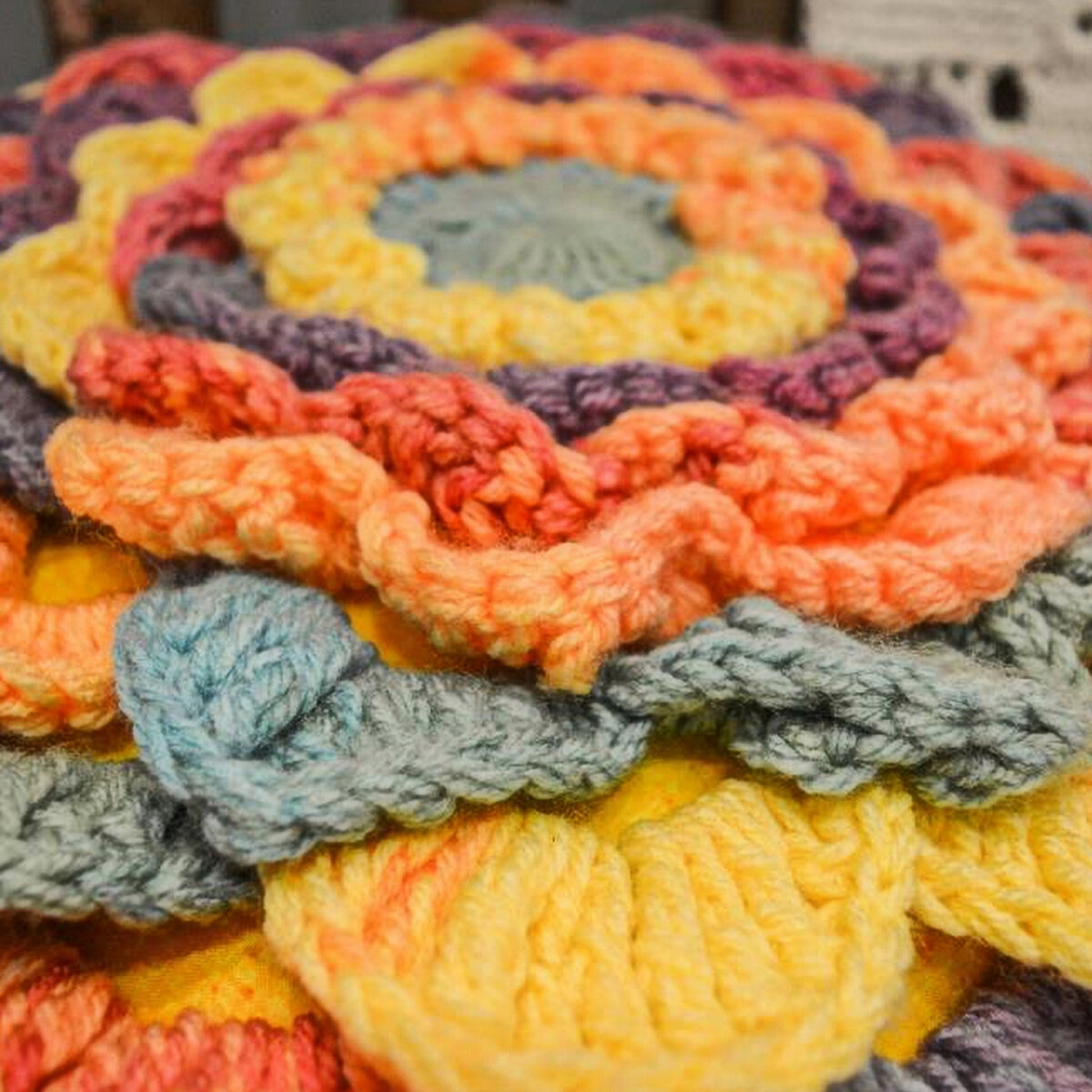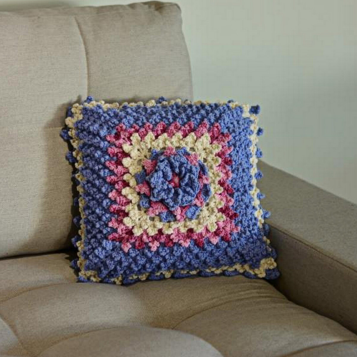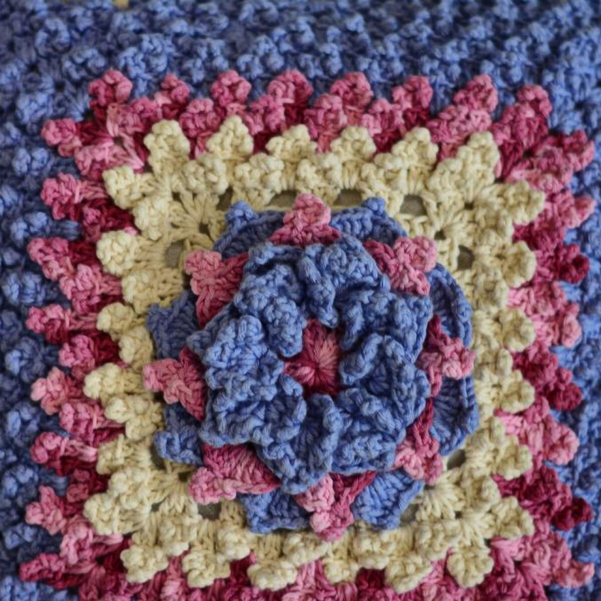 Объёмная подушечка-цветок. Нежное сочетание пастельных оттенков: светло-синего, лимонного и розового меланжа. Объёмный узор идёт только с лицевой стороны, обратная сторона — сеточка из столбиков с накидом. При желании можно обе стороны связать с цветком, причём в разной цветовой гамме, — и менять сторону под настроение.