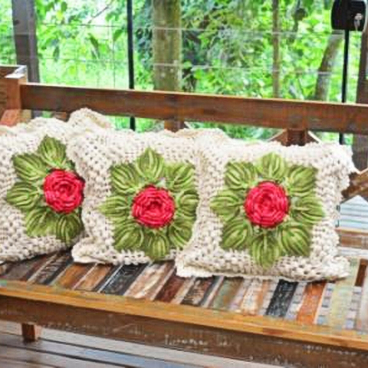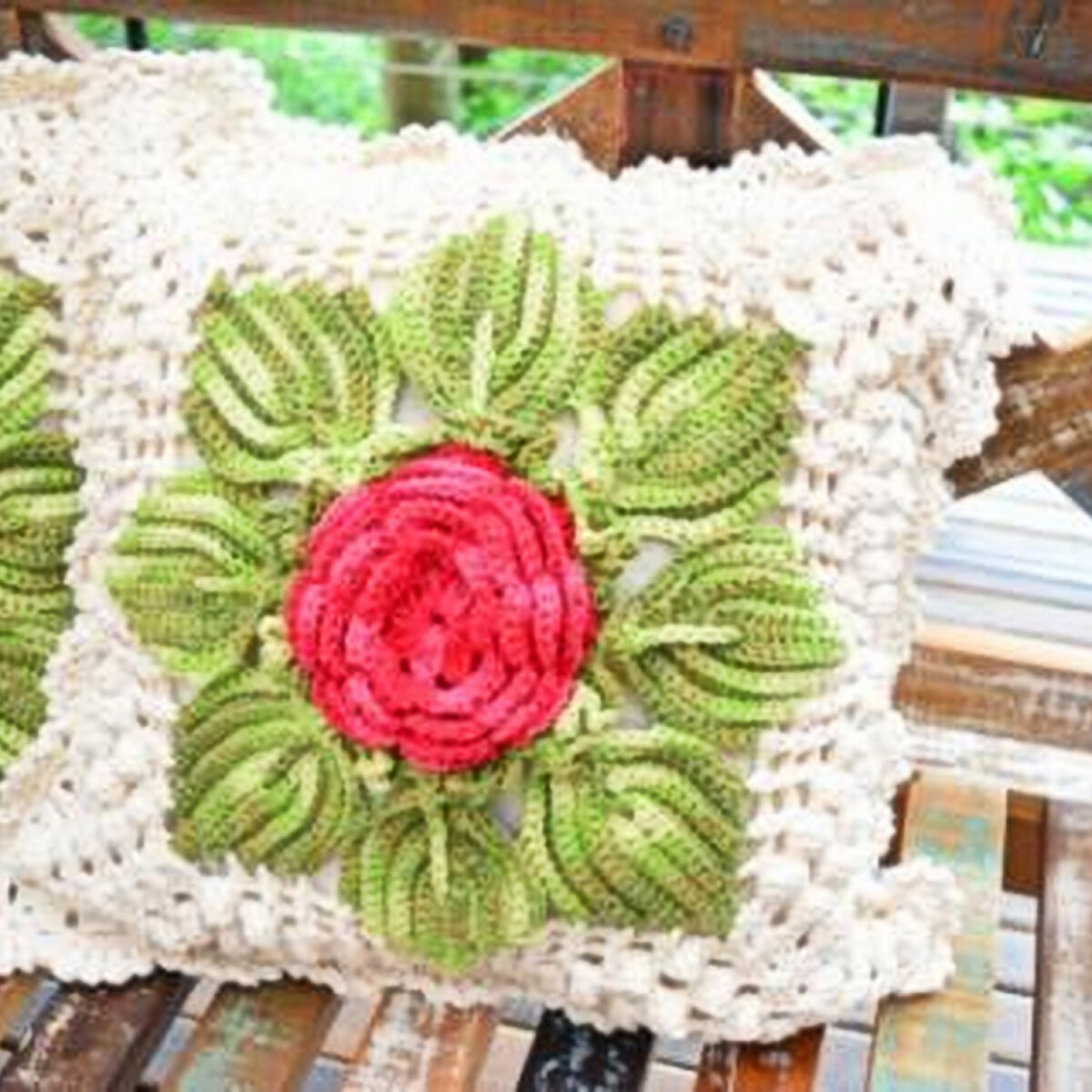 Эффектная подушка с розой, окружённой зелёными листочками на белом фоне. Оборотная сторона подушки — белая сетка. Но, опять же, можно и оборотную сторону связать с цветком другого оттенка, например.