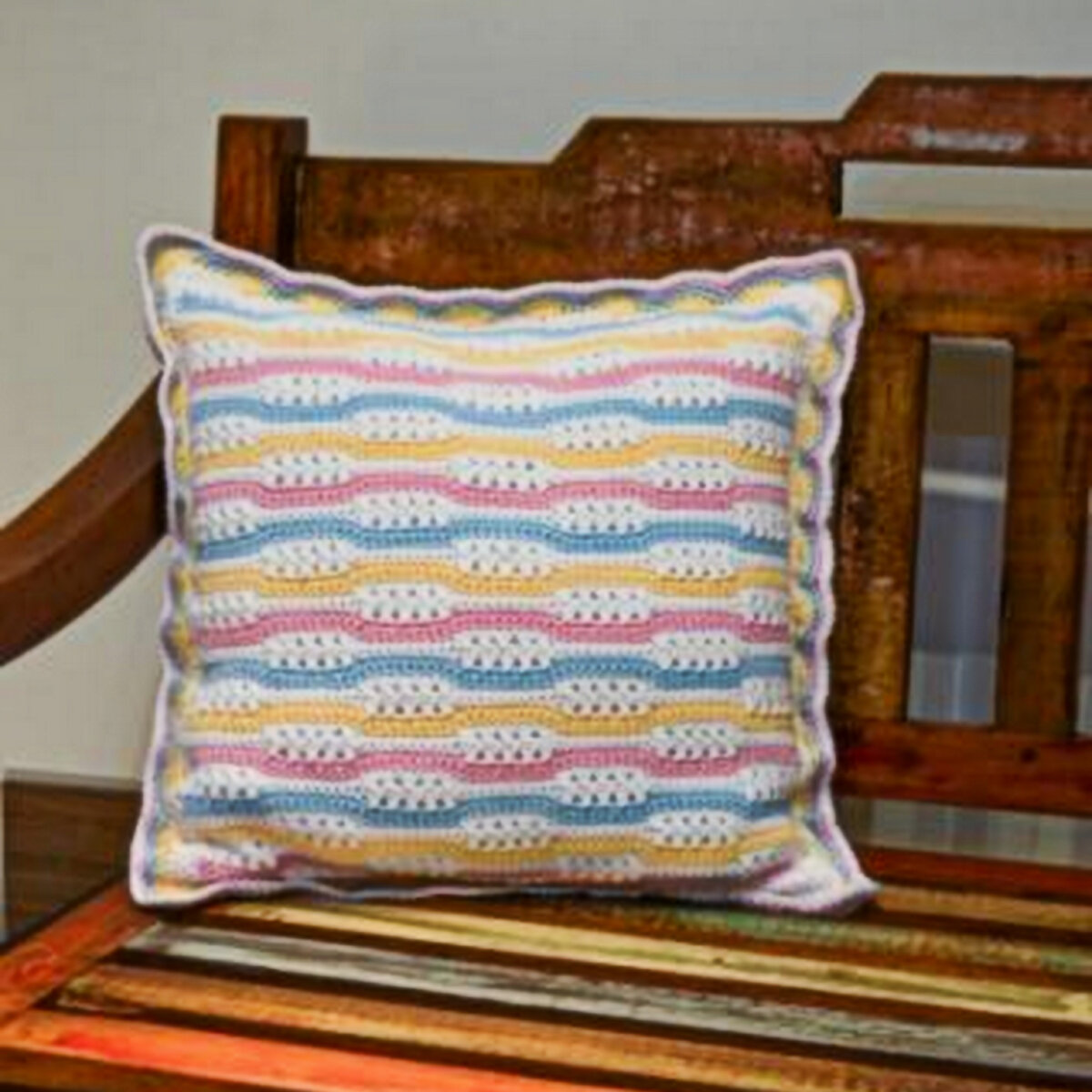 Чудесная разноцветная подушка с волнистыми дорожками — нежное сочетание жёлтого, белого, розового и голубого цветов. Оборотную сторону рекомендуют связать однотонной жёлтой сеткой, но я бы её вязала так же, как лицевую.